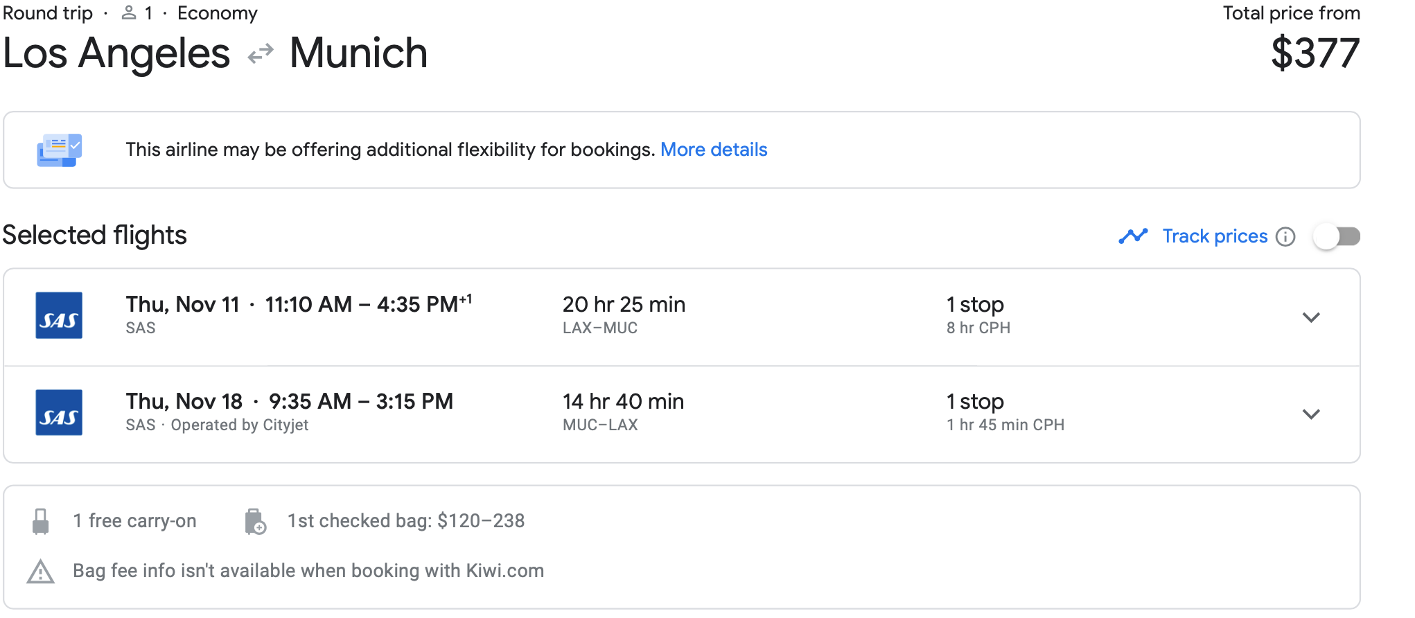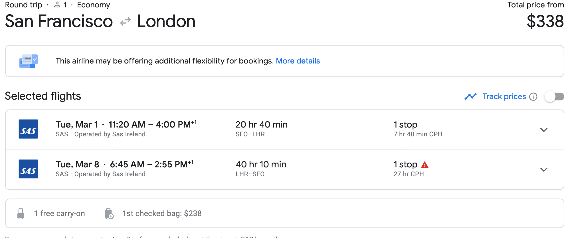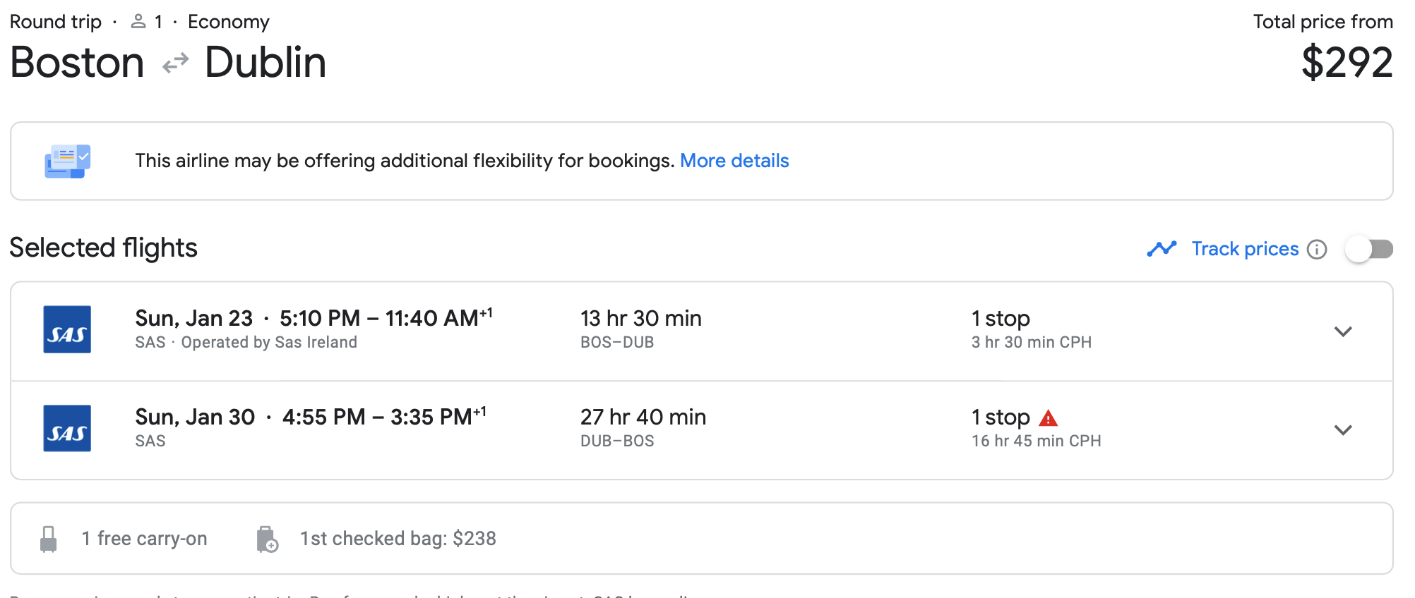 Again, that price comes with some long layovers, including a 27-hour stop in Copenhagen. You can find other flights with shorter layovers, but that will cost you around $420 per ticket during the sales period. But if you don't mind taking a quick day trip through Copenhagen, then this itinerary may be just right for you.