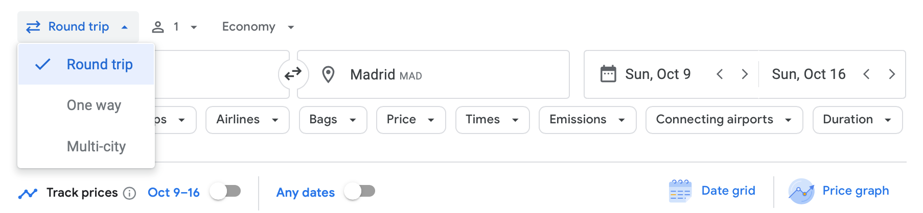 Let's start by showing some of the stopover options we discovered. I first searched for options for flights from Miami to Madrid. Google Flights makes this rather easy. The first step when you get to the site is to go to the drop-down menu in the top left, click the tab and select "Multi-city."