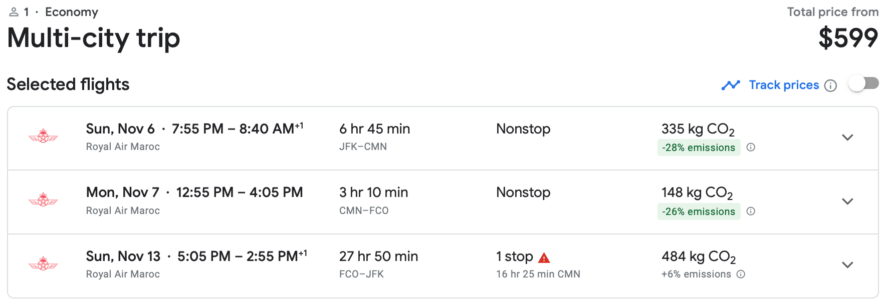Another interesting stopover possibility we found involved an itinerary from New York City to Rome. You can fly from John F. Kennedy International Airport (JFK) to Rome Fiumicino Leonardo da Vinci Airport (FCO) in November with a 27-hour stopover in Casablanca each way. That gives you two days to enjoy the city. The total cost is $599 round-trip.