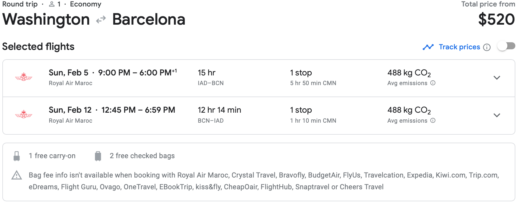 There's also the fact that Royal Air Maroc gives passengers two free checked bags, so you can save as much as $150 per person round-trip by not having to pay to check luggage.