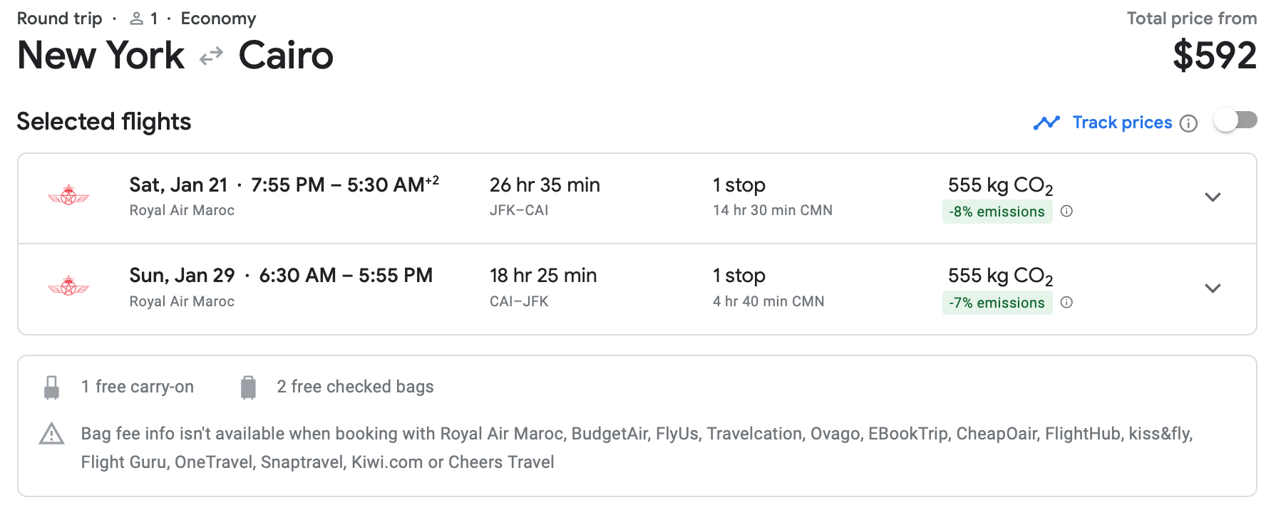 There are also good prices on flights from New York City to Cairo International Airport (CAI) in this deal. This January ticket is just $592 round-trip. The layover in Morocco is also long enough to allow for some exploration time.