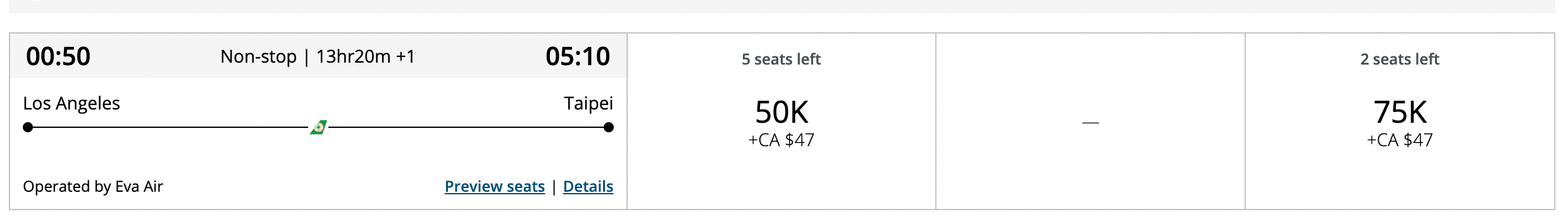 As EVA Air is a member of Star Alliance, there are multiple ways to book these seats. My favorite way is to book through Air Canada's Aeroplan program. Aeroplan charges just 75,000 points for a one-way business-class seat to Asia.