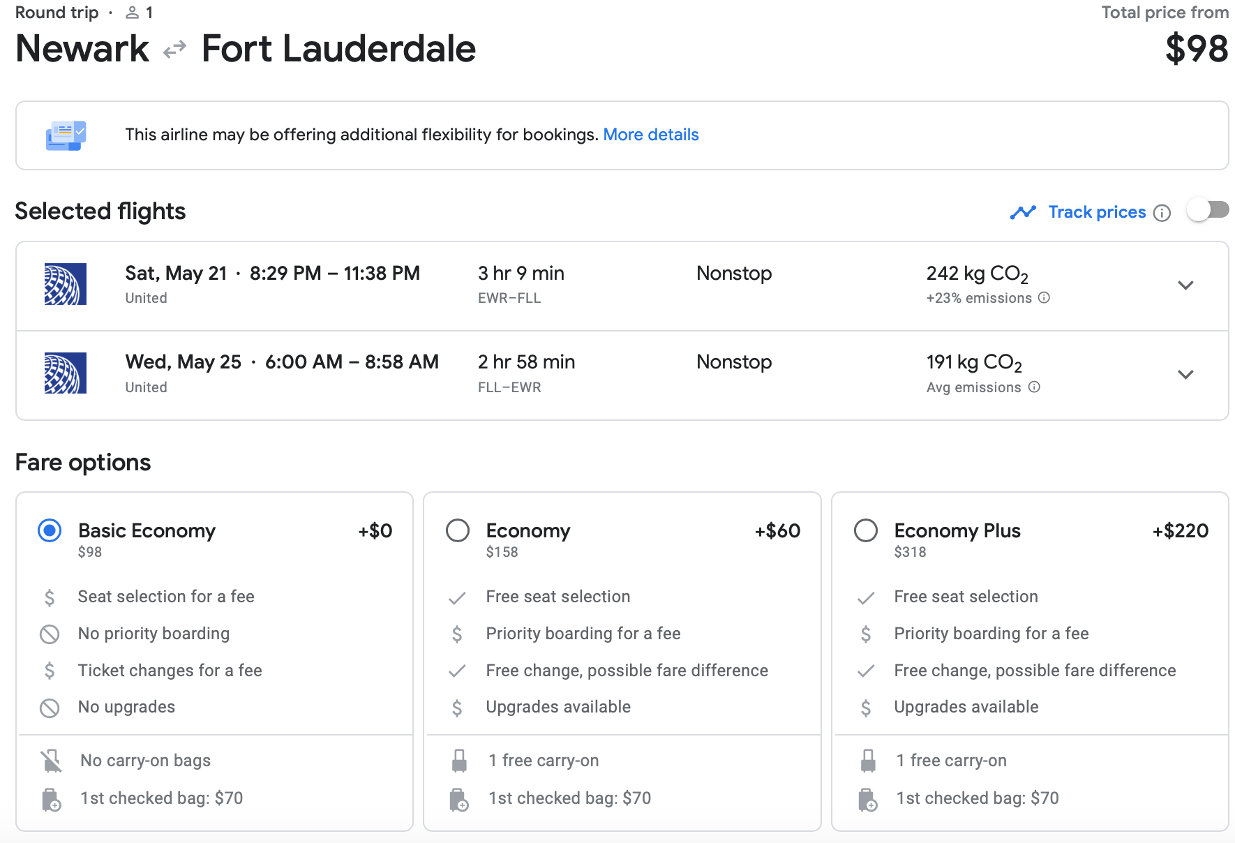 We found non-stop fares from Newark (EWR) to Fort Lauderdale (FLL) in late May for just $98 round-trip. No full-sized carry-on bags allowed with this fare, but upgrading to the economy tier costs just $60 and gives you a free carry-on, which is cheaper than paying $70 to check a bag.