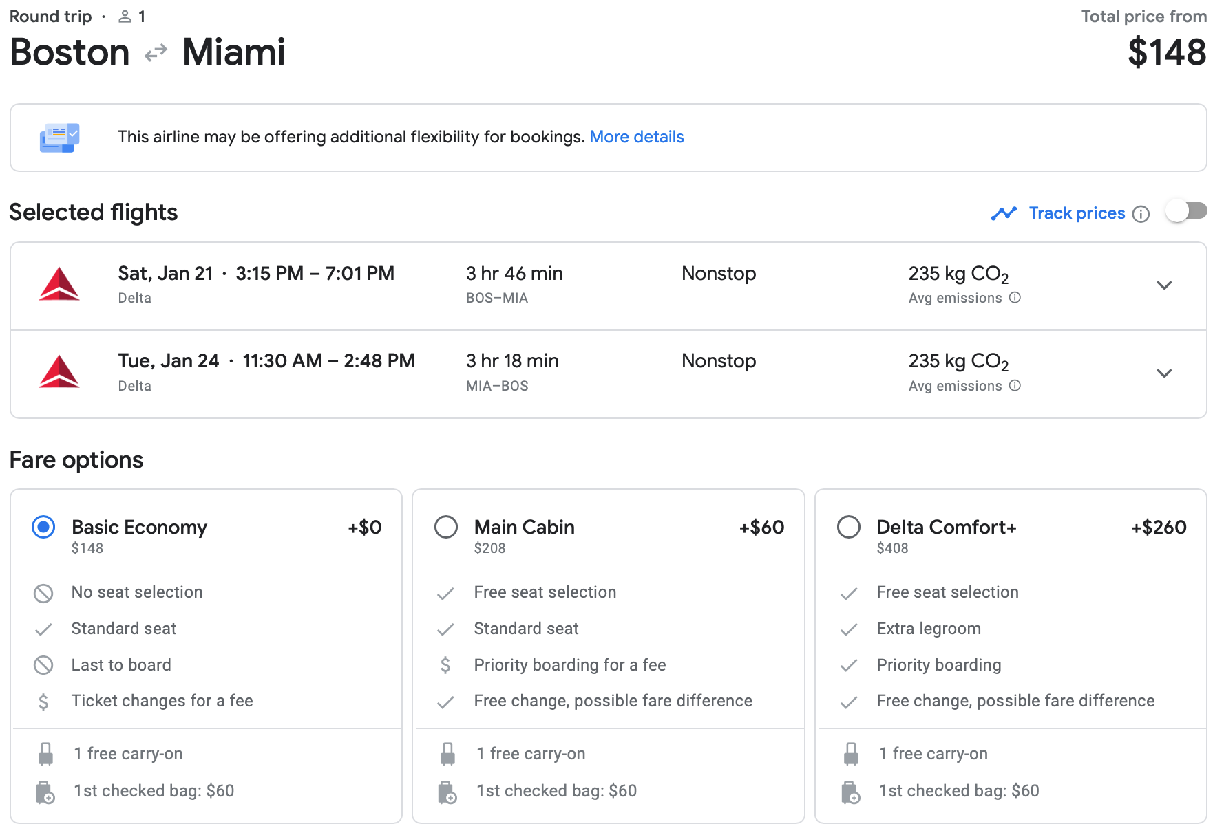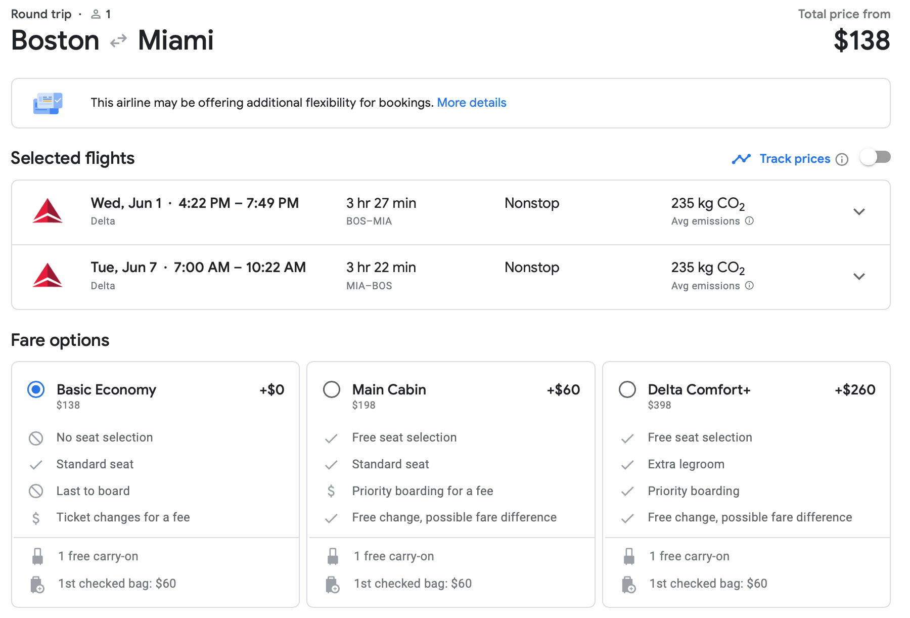 Boston (BOS) to Miami is one route we found with good sale prices during the summer and as far out as January 2023. Nonstop flights on Delta are available for as low as $138 round-trip and they come with a free full-sized carry-on bag.
