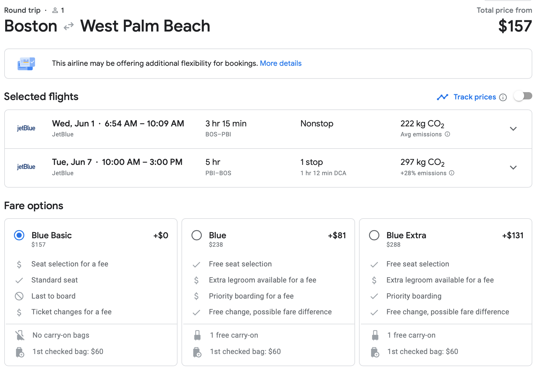 Boston was the departure city that had the most availability in this sale. JetBlue had June itineraries from Boston to West Palm Beach (PBI) at the greatly-reduced price of $157 round-trip. The return flight includes a layover, but this a really good price for a popular summer route.