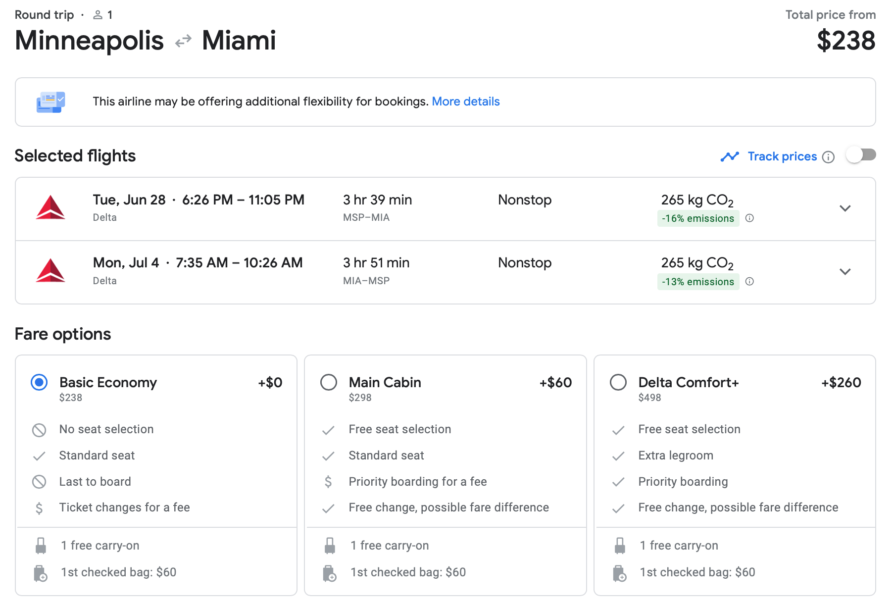 Non-stop flights from Minneapolis (MSP) to Miami in June can be booked on Delta for only $238.