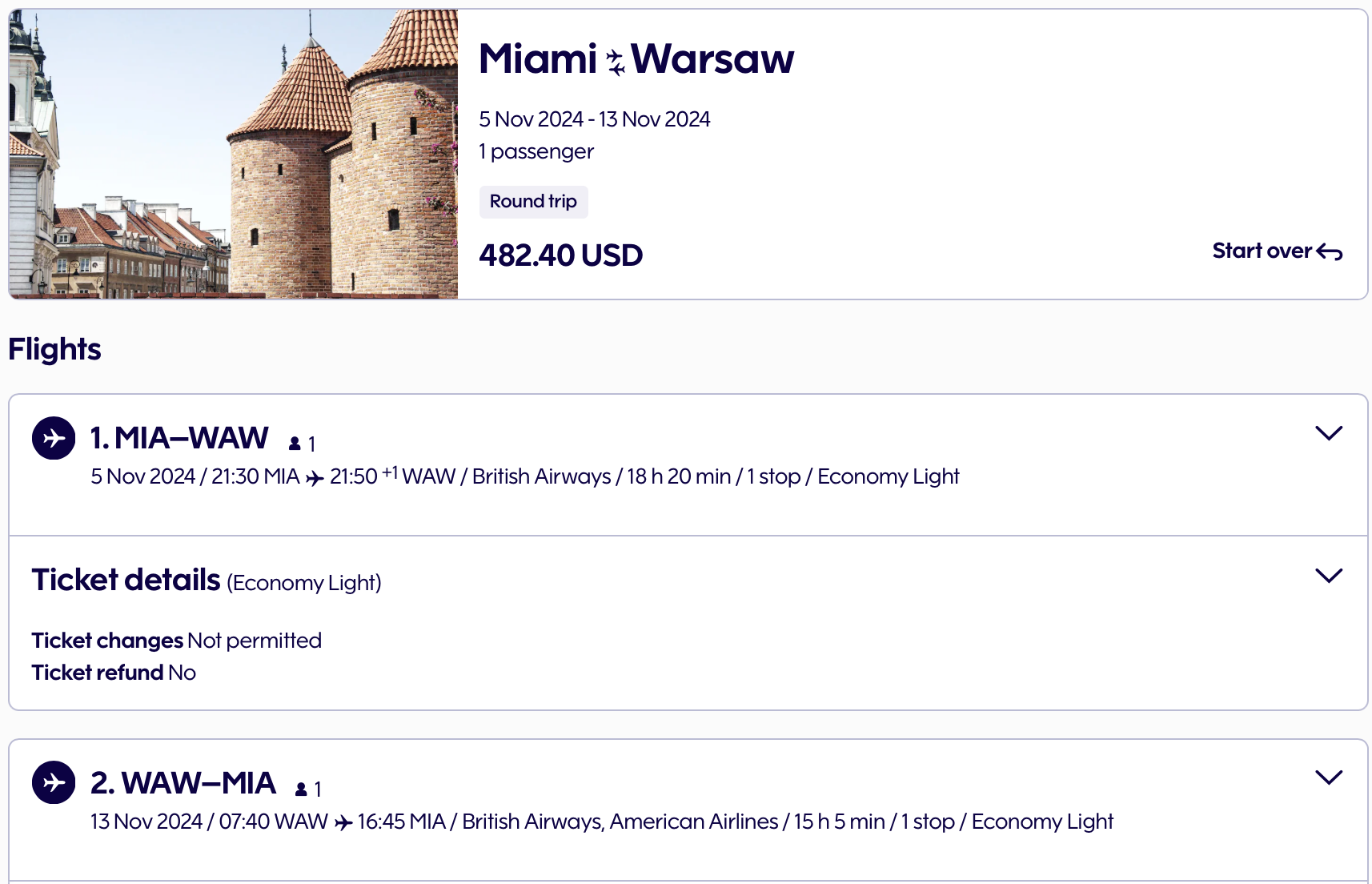 - Miami International Airport (MIA) to Warsaw Chopin Airport (WAW) - $482