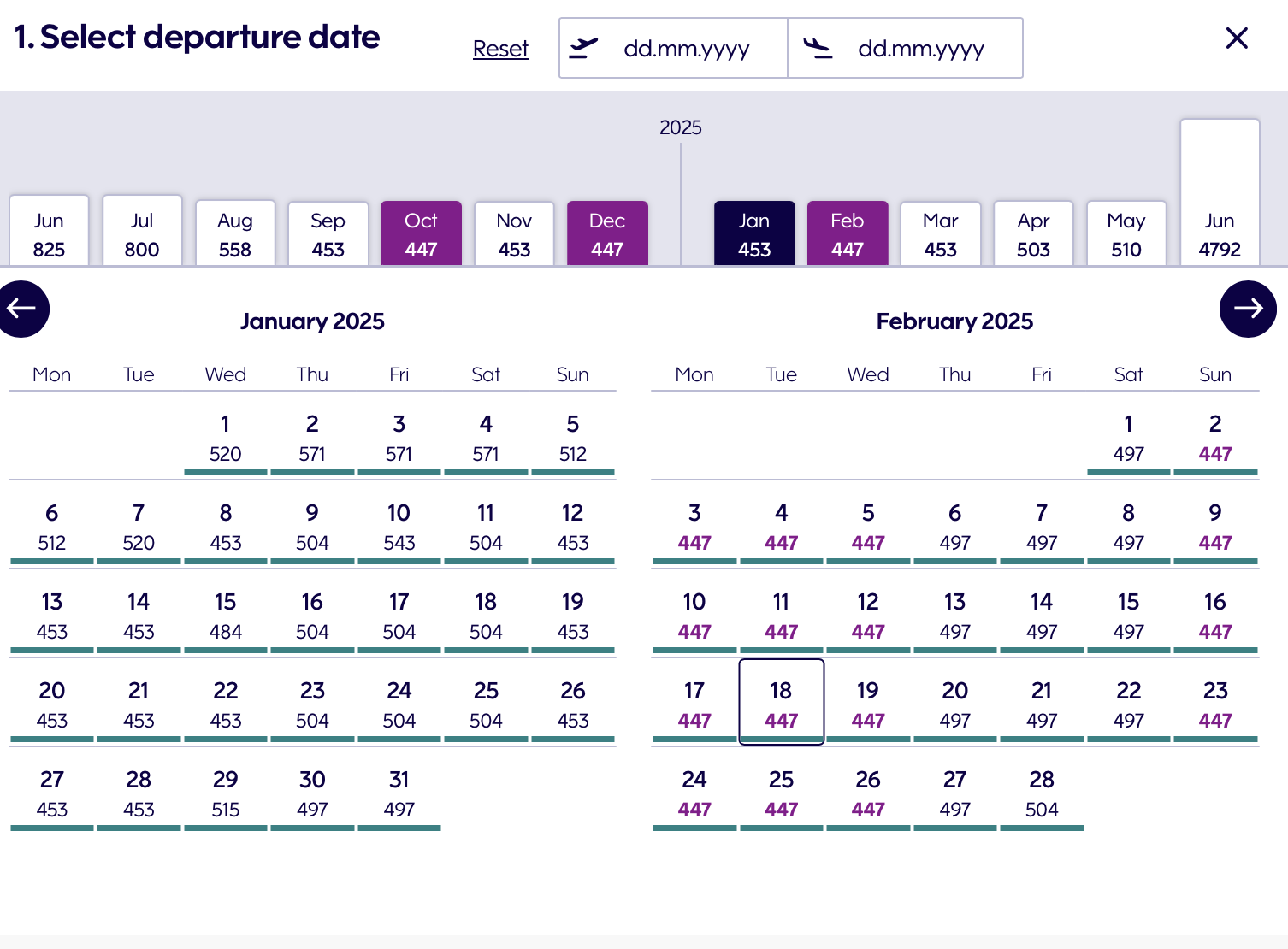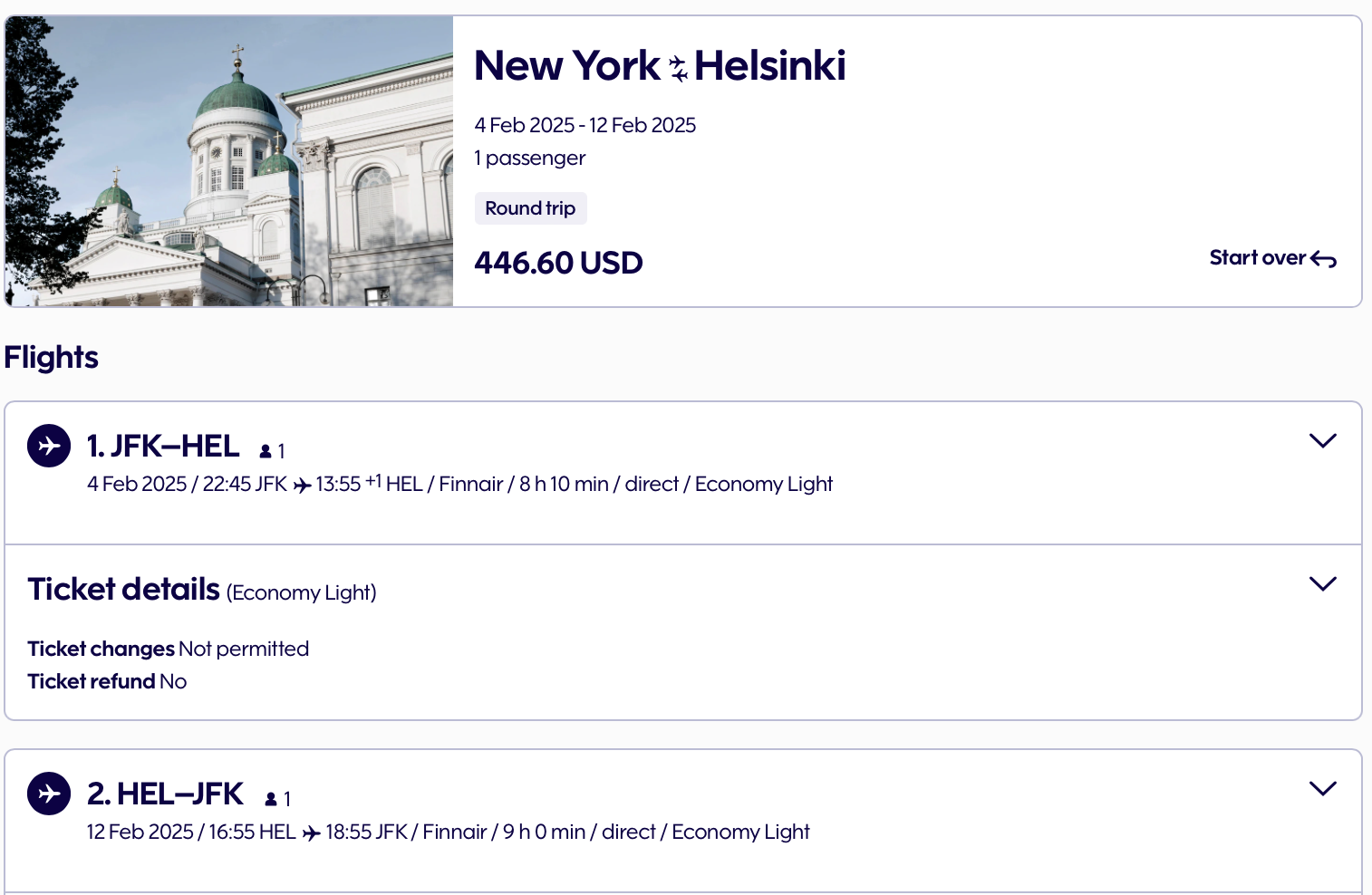 Here's one itinerary from John F. Kennedy International Airport to Helsinki Airport for only $447 round-trip. As the calendar view above shows, you have lots of options at this price in February.