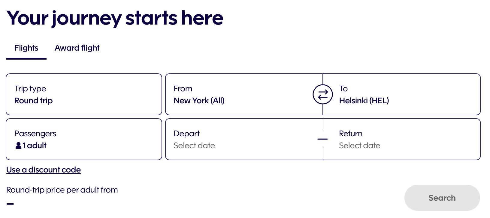 You will then get a calendar view. Just go to the month you want to travel in, and begin your search. The screenshot below shows the prices for available flights in February from New York City to Helsinki.