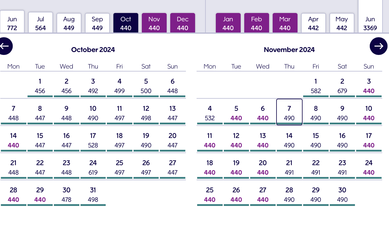The travel window for discounted Finnair flights primarily takes place between October 2024 and February 2025, with the best availability and prices in November. Most itineraries include layovers.