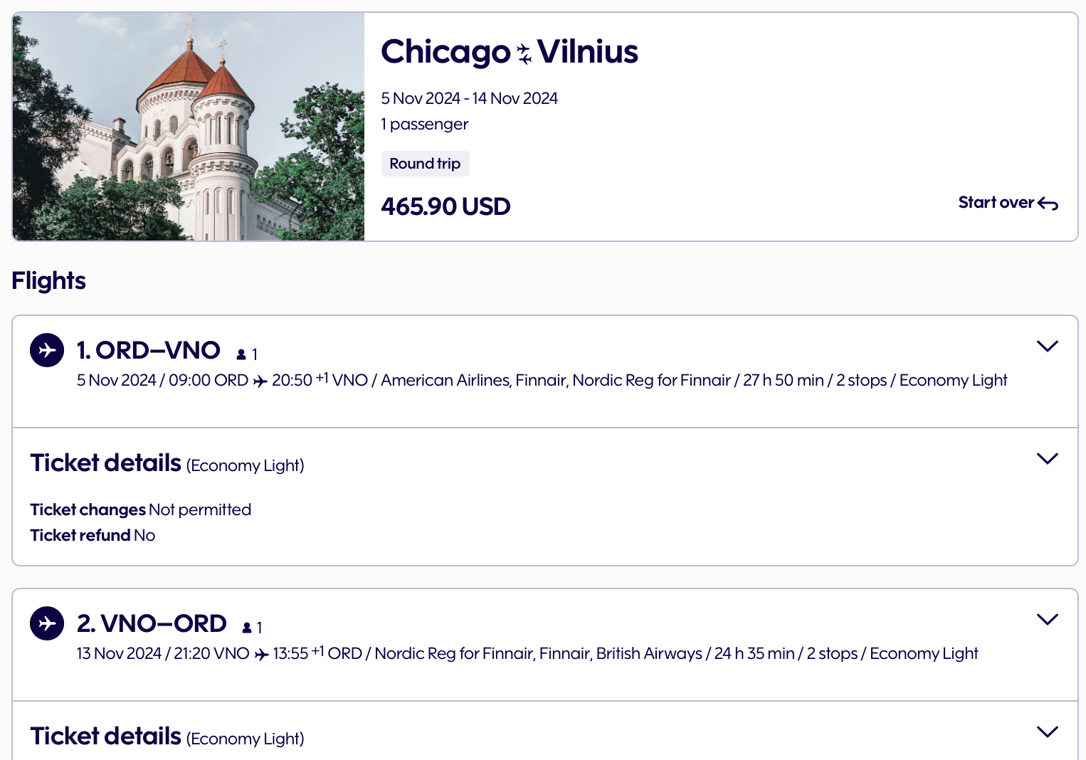 Round-trip flights to Lithuania are also available in this sale. You can fly out of Chicago's O'Hare International Airport to Lithuania's Vilnius International Airport in November for $466.