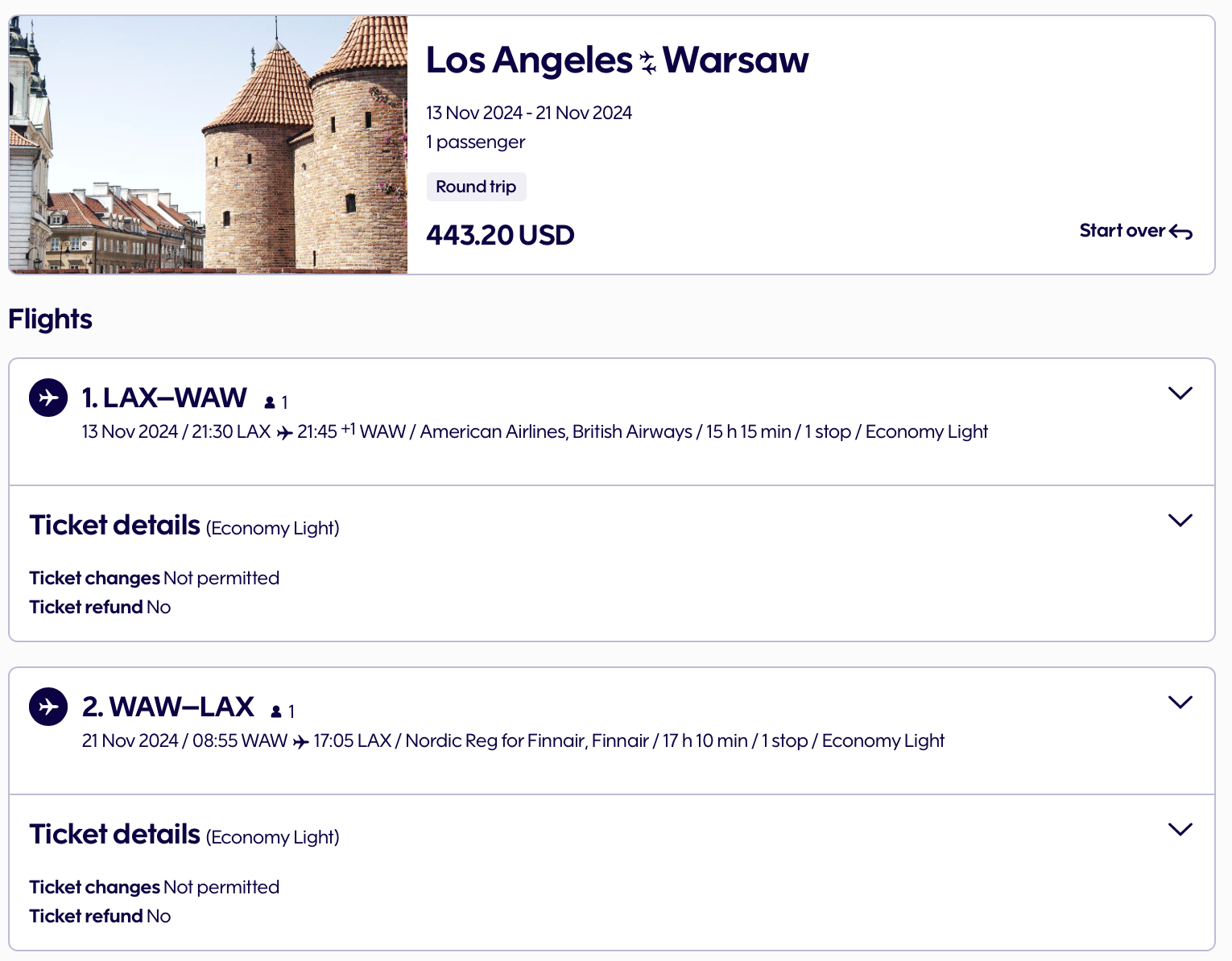 Here's an excellent deal for West Coast travelers. This itinerary from Los Angeles International Airport to Warsaw is just $443 round-trip.