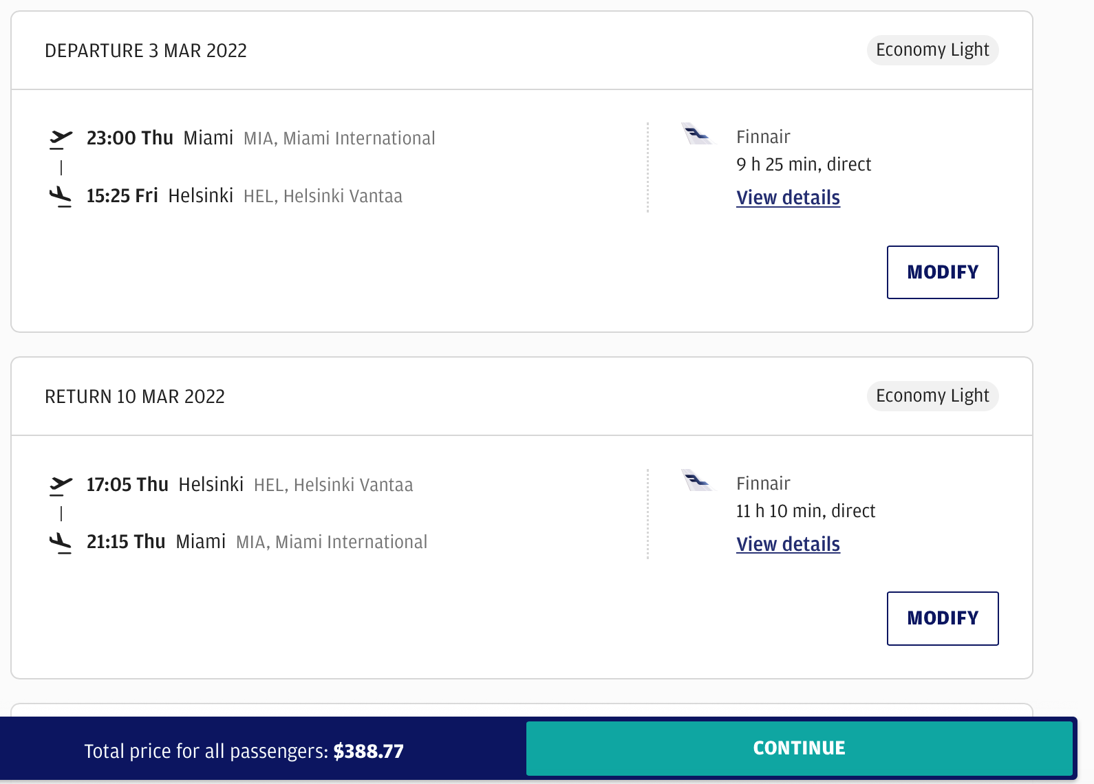 - Miami (MIA) to Helsinki (HEL) - $388
