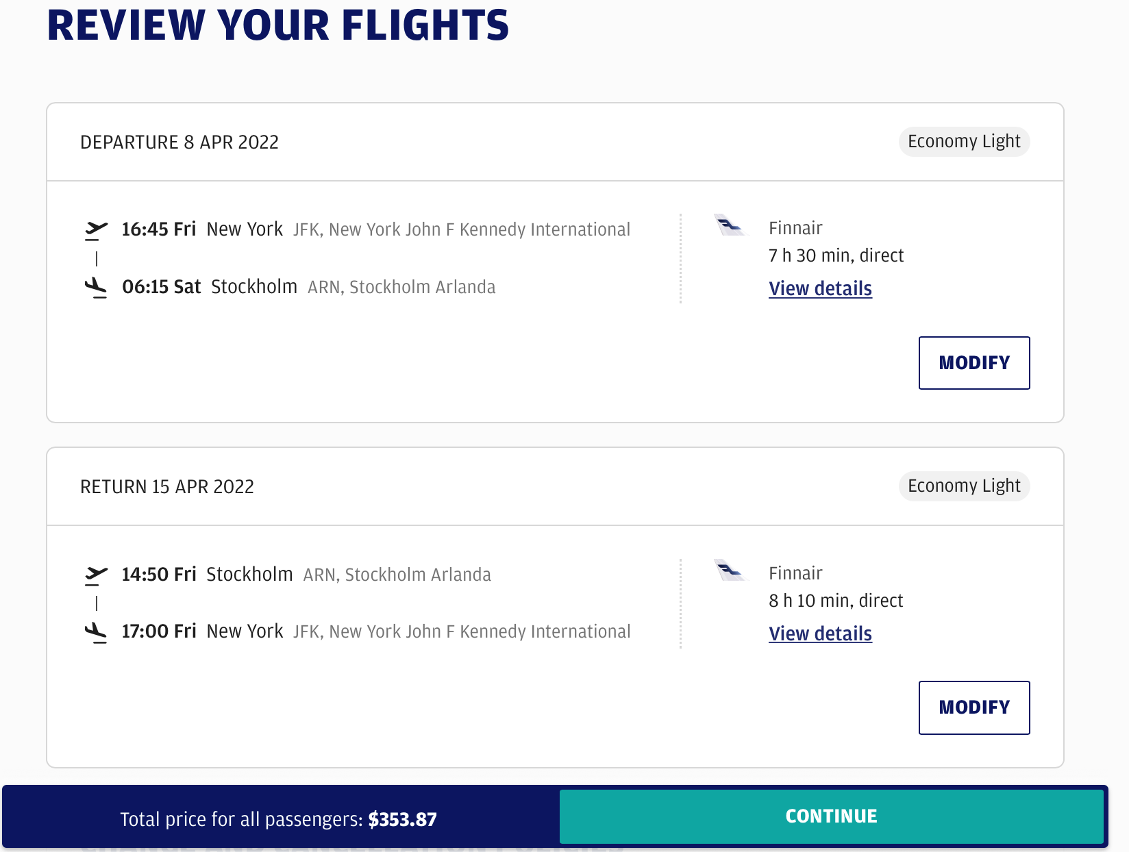 - NYC (JFK) to Stockholm (ARN) - $353