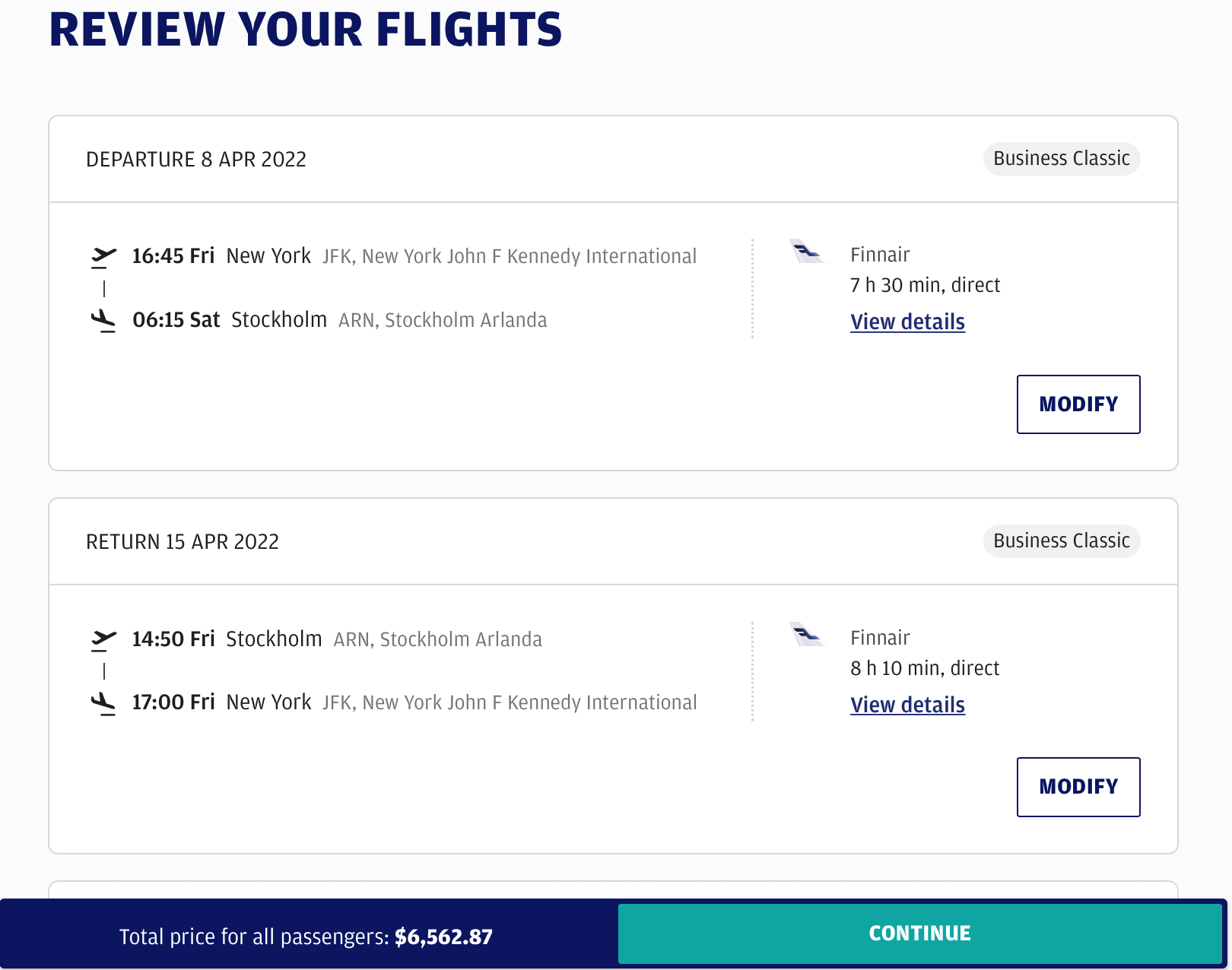 As we mentioned, Finnair's sale also extends to its business-class seats. The same NYC-Stockholm itinerary in business class is priced just under $6,600, which is incredibly expensive, but if you search now you can find a business class round-trip for as low as $2,213 for other routes. If flying business class is within your budget, you can score a good deal.
