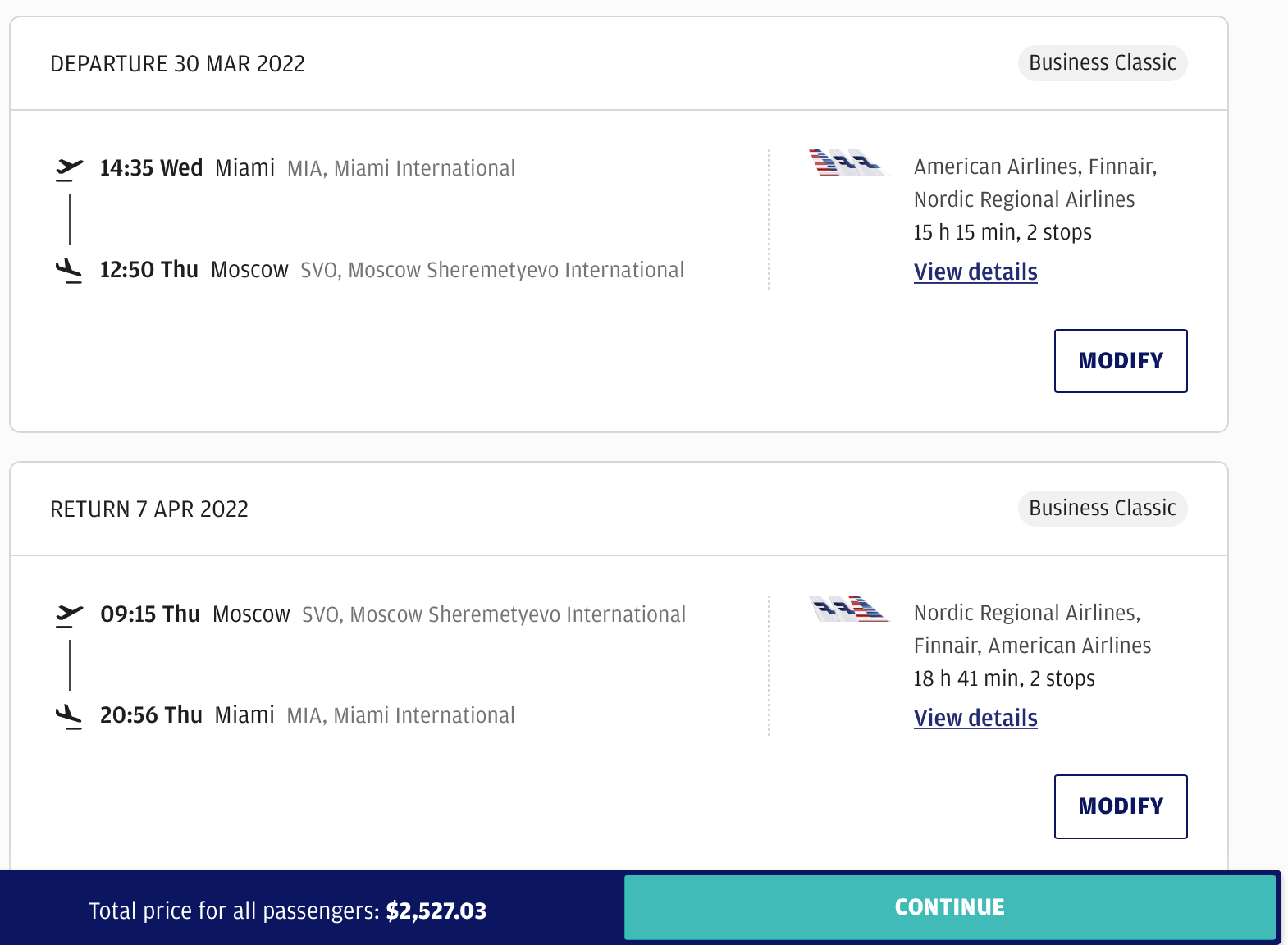 Miami to Moscow (SVO) in business class is available at a reduced rate.