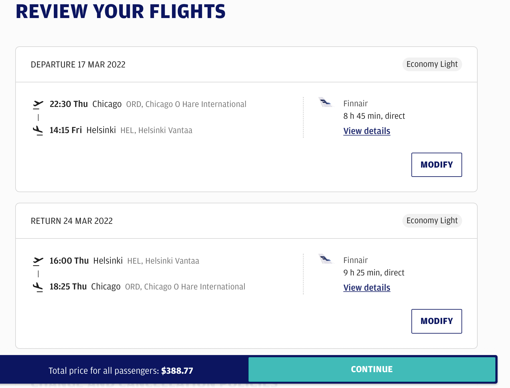 - Chicago (ORD) to Helsinki (HEL) - $388