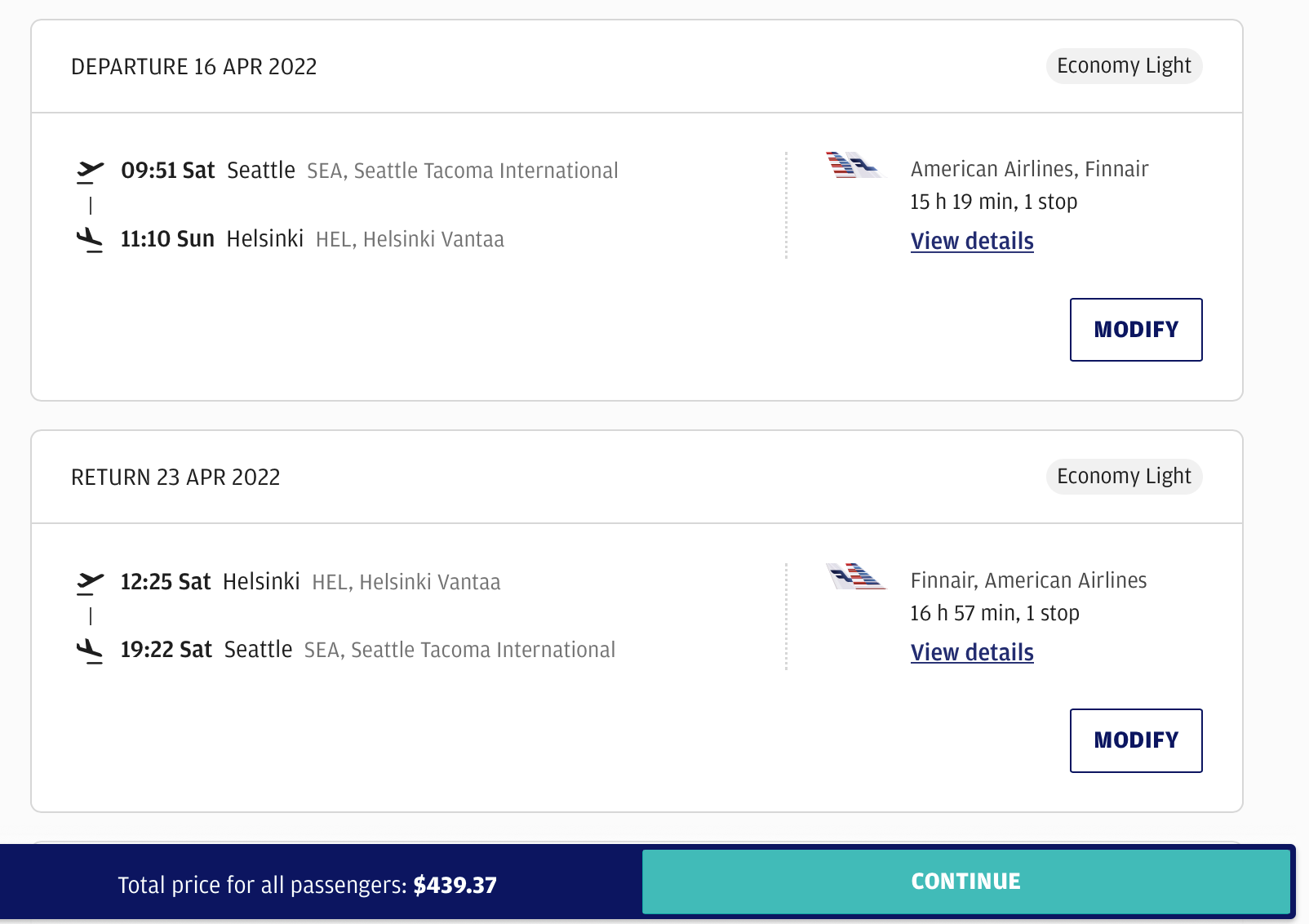 - Seattle (SEA) to Helsinki (HEL) - $439