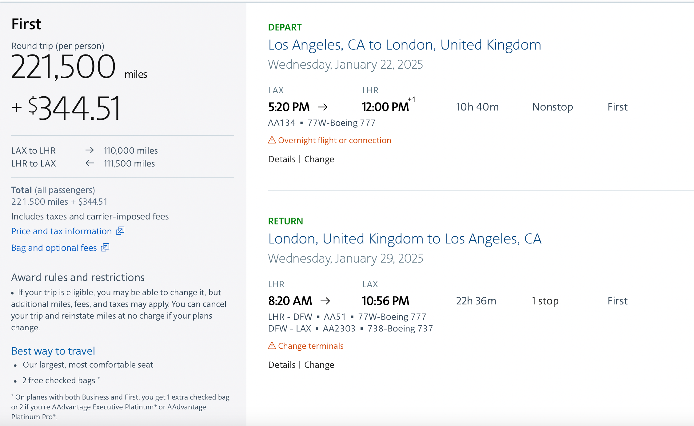 Here's one round-trip Flagship First itinerary we found in late January from LAX to LHR for 221,500 AAdvantage miles, plus $344.51 in taxes and fees.