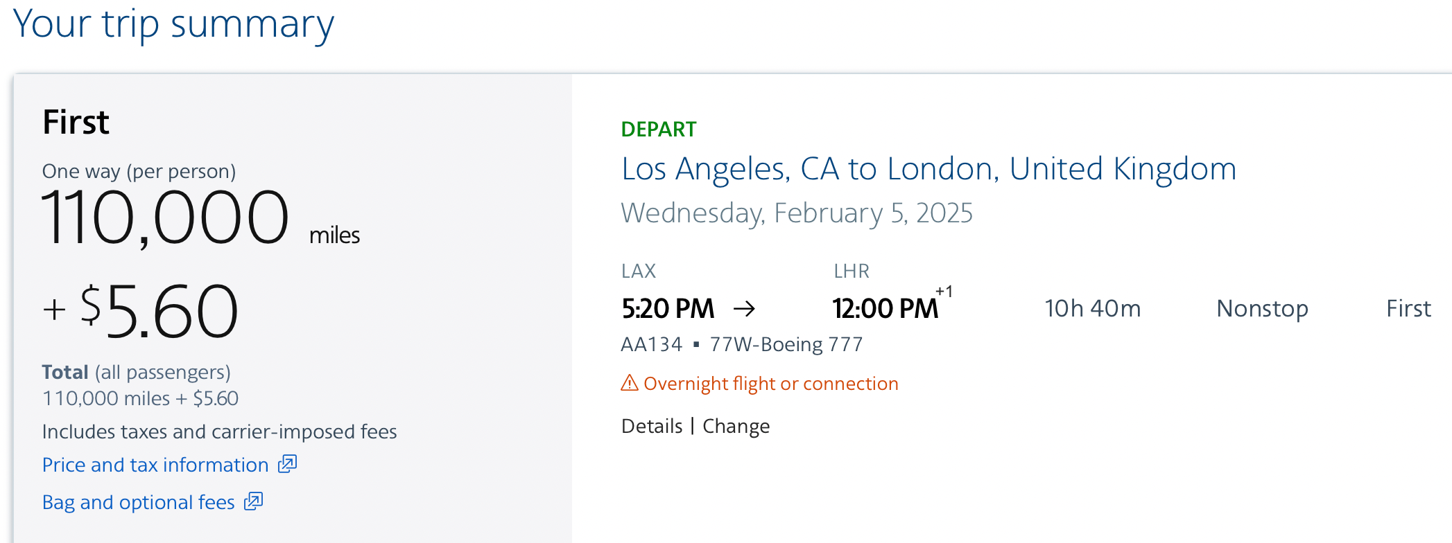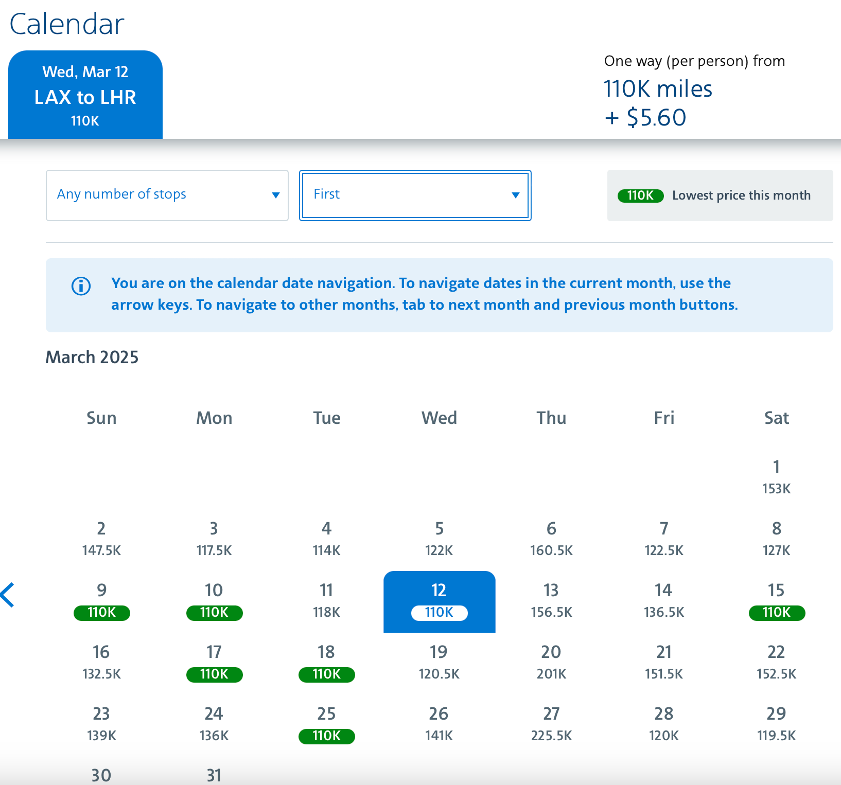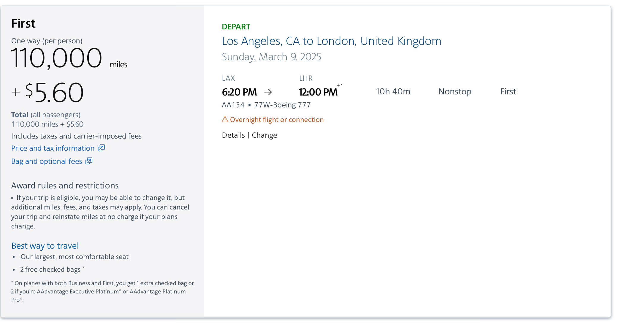 As the calendar screenshot we showed earlier indicates, March has the best availability from LA to London. There are several options to book one-way flights in Flagship First that month for 110,000 AAdvantage miles, including this outbound flight from LA on March 9.