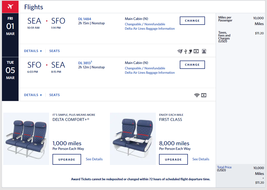 Seattle (SEA) to San Francisco (SFO) for 10,000 miles + $11 in taxes and fees round-trip — or 12,000 miles round-trip in Delta Comfort+: