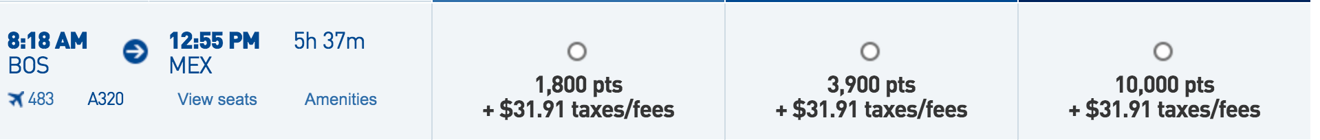 Boston (BOS) to Mexico City (MEX) for 1,800 points + $32 one-way: