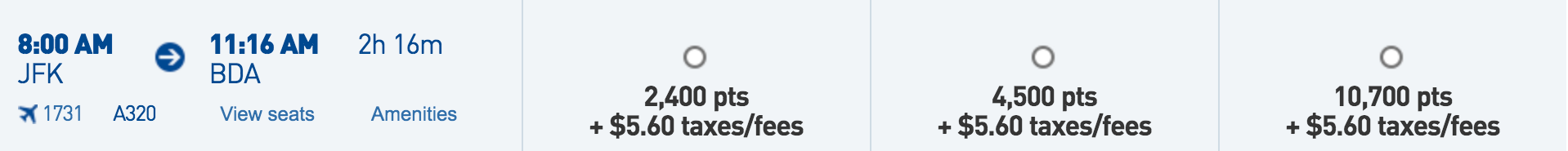 New York (JFK) to Bermuda (BDA) for 2,400 points + $5.60 one-way: