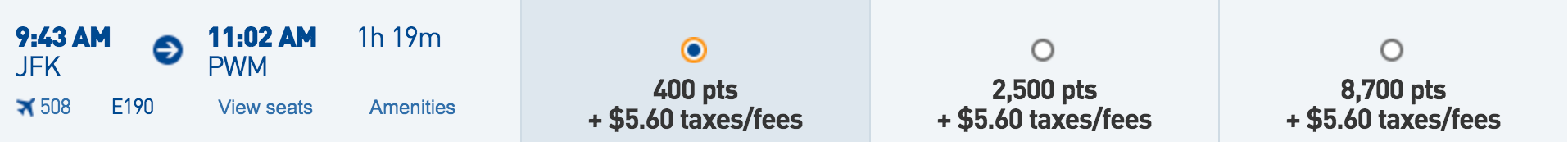 This is a good opportunity to use your TrueBlue points since award redemptions are tied to the cost of the ticket. You can transfer points from Citi ThankYou, Amex Membership Rewards and Chase Ultimate Rewards to JetBlue.