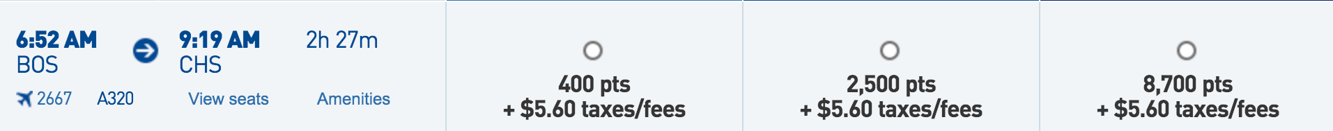 Boston (BOS) to Charleston (CHS) for 400 points + $5.60 one-way: