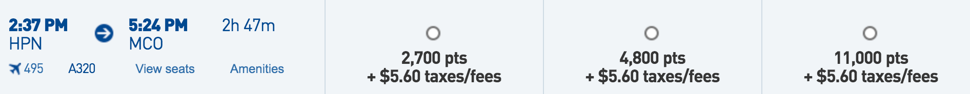 Westchester County (HPN) to Orlando (MCO) for 2,700 points + $5.60 one-way: