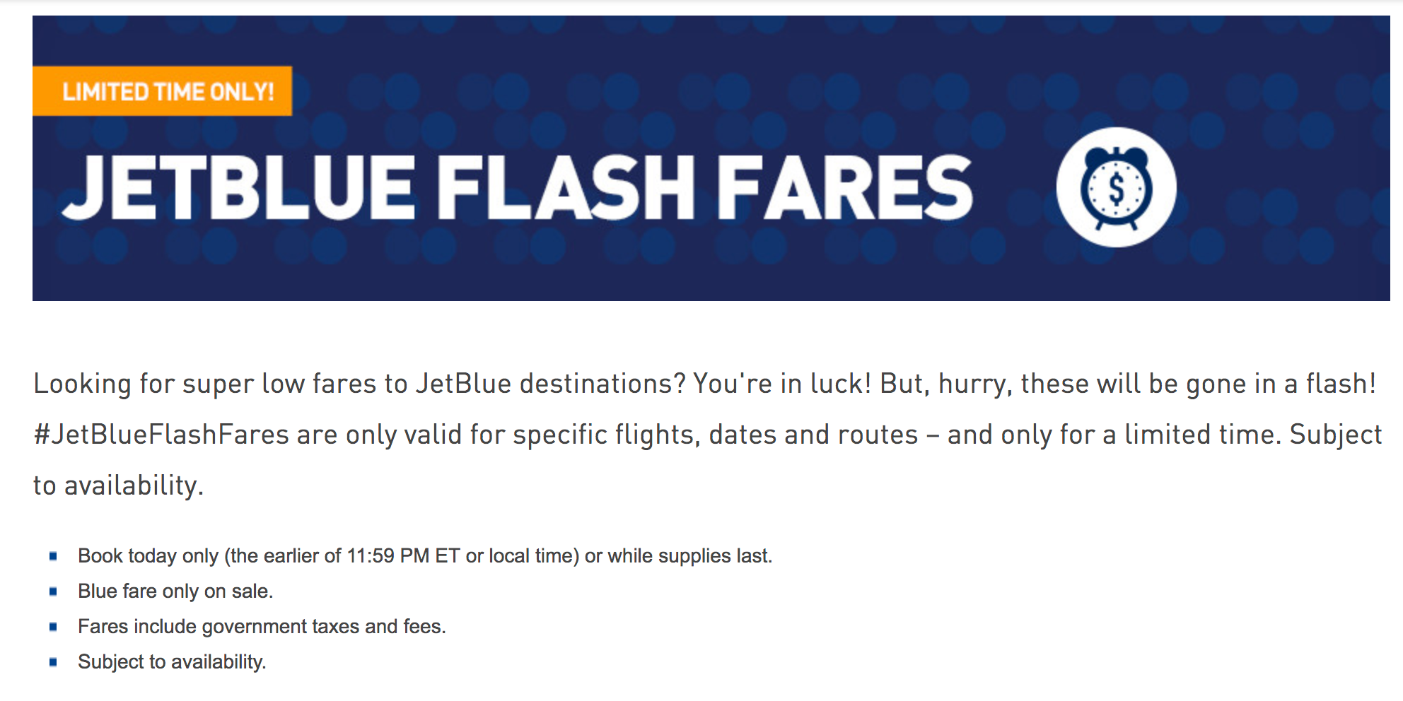 To search, head to JetBlue's flash fares page and filter the list by your departure city.