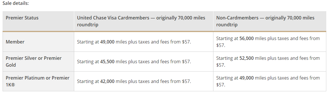 The exact amount of your discount is going to depend on your United Premier status and whether or not you have a Chase co-branded credit card. Premier Platinum and top-tier Premier 1K elites that have a co-branded card can book one-way flights for just 21,000 miles plus $5.60 in taxes and fees:
