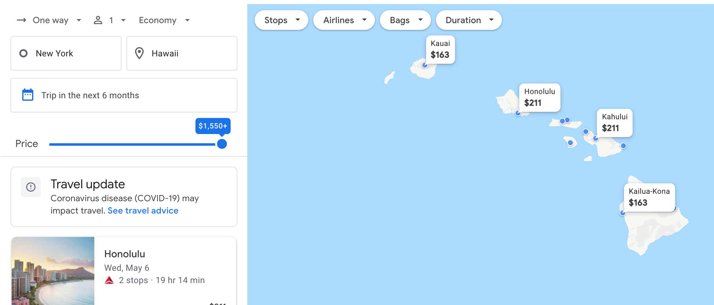 Here's a map of prices for New York City to Hawaii from Google Flights. (Just keep in mind that this map shows you the next six months, so the cheapest fares may be for dates where we know we won't be ready for leisure travel.)