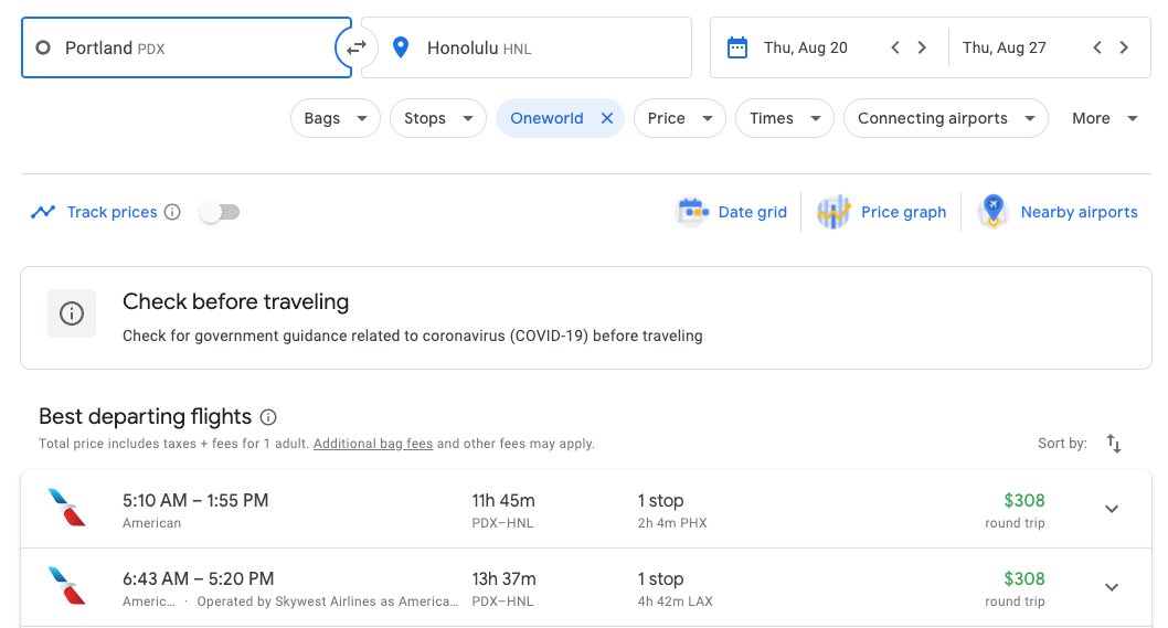 Portland - Honolulu: $308 on American