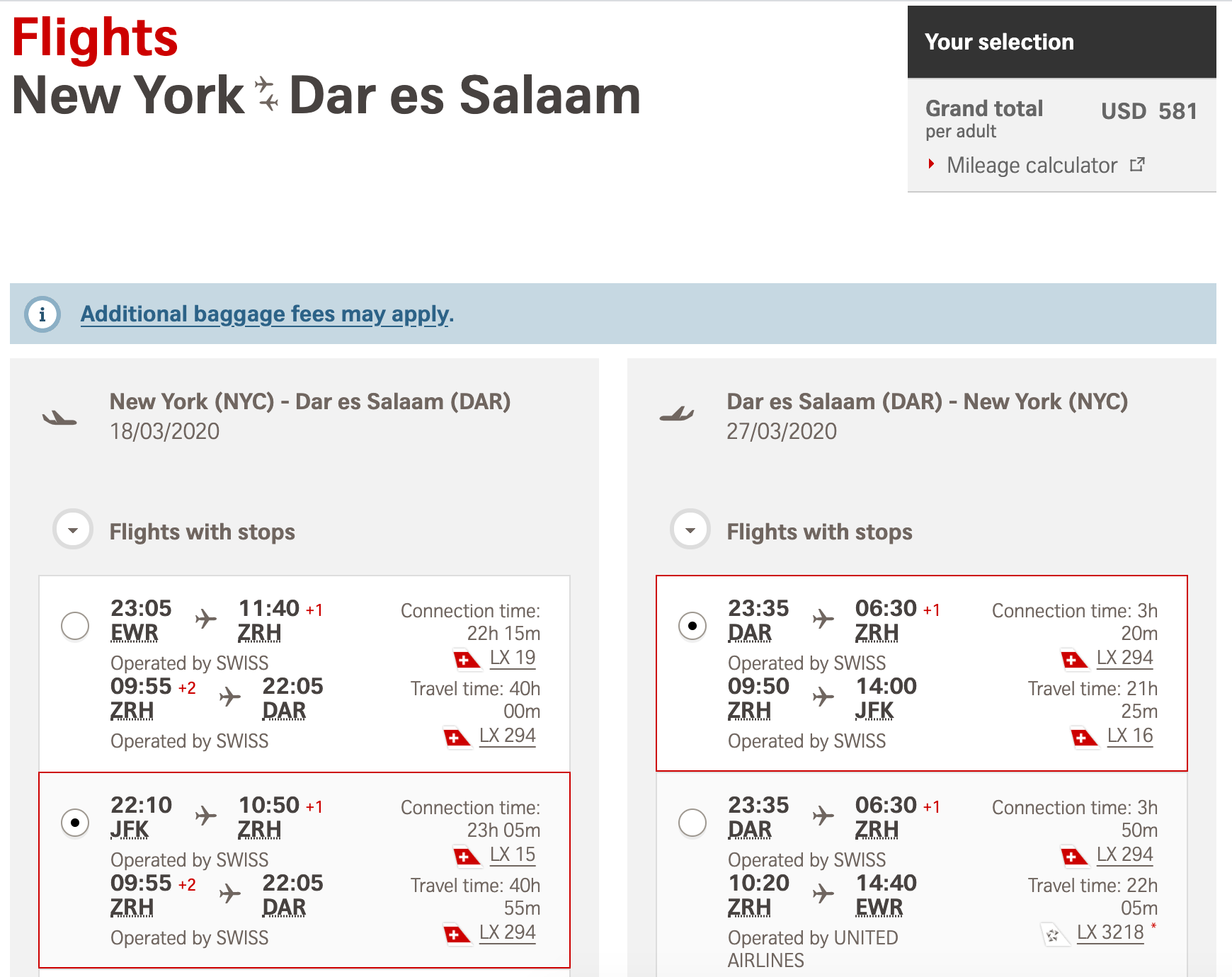 New York/Newark (EWR) to Dar es Salaam, Tanzania (DAR) on SWISS for $581 round-trip: