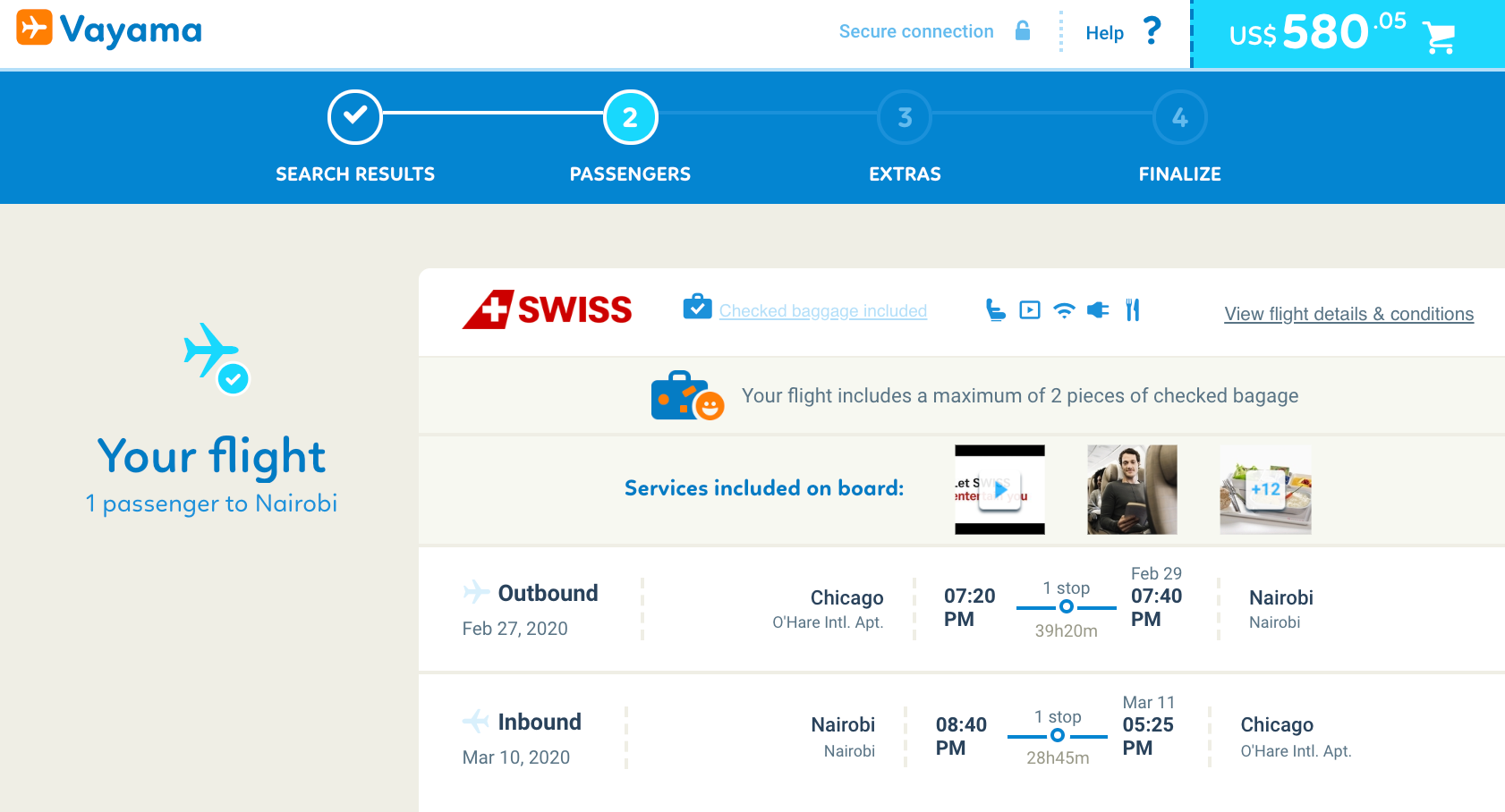 Chicago (ORD) to Nairobi, Kenya (NBO) for $580 round-trip on SWISS via Vayama: