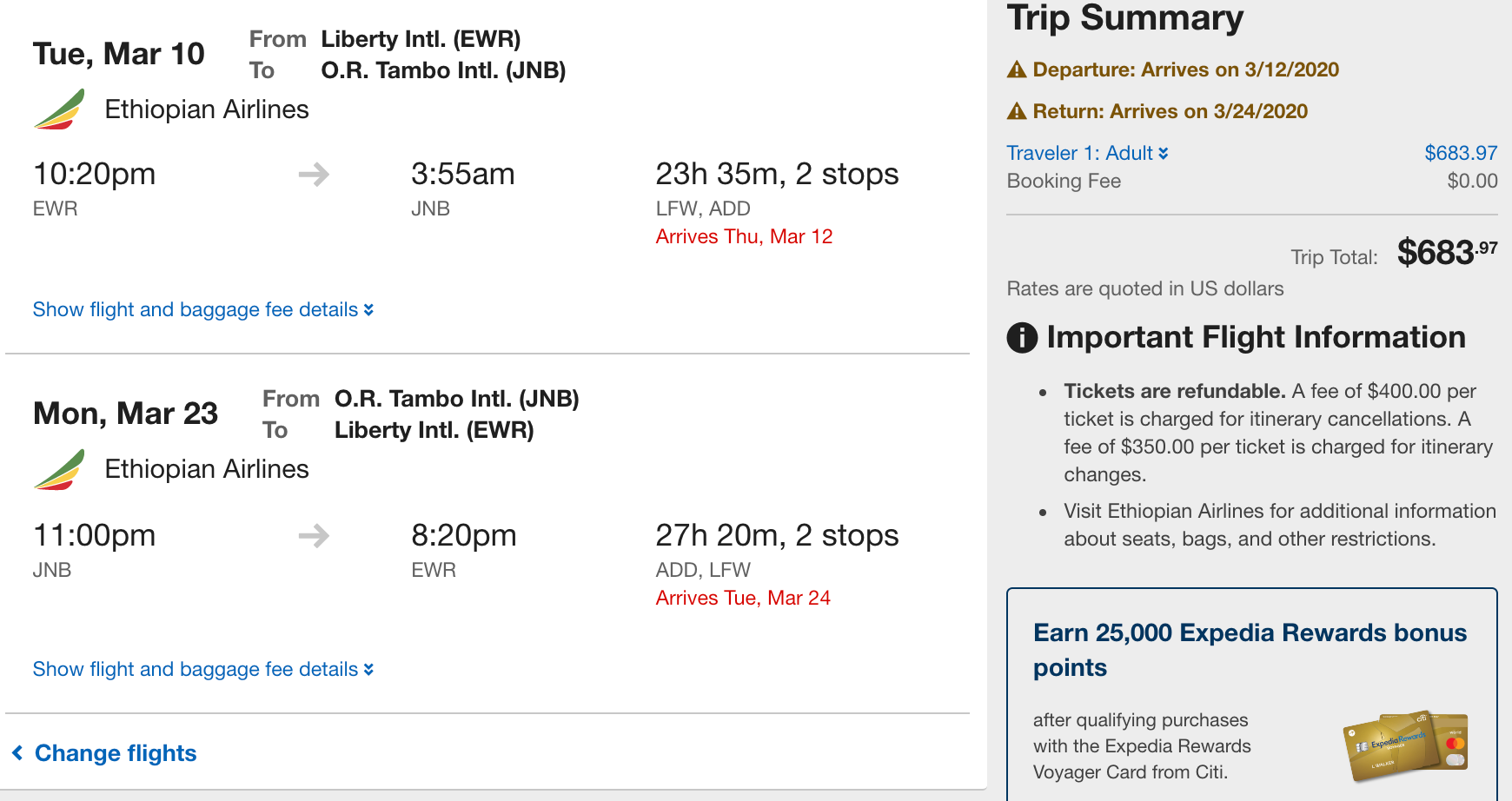 New York/Newark (EWR) to Johannesburg, South Africa (JBO) on Ethiopian for $684 round-trip via Expedia: