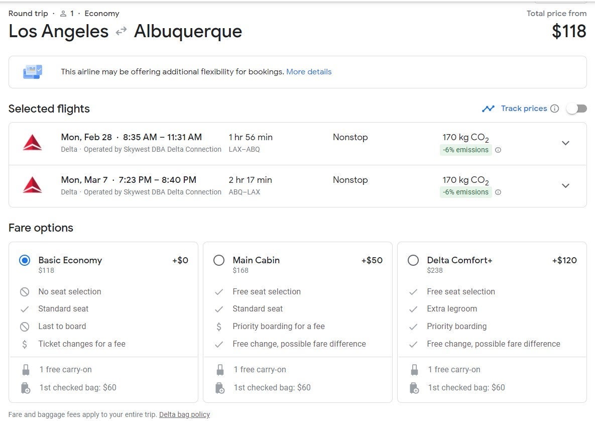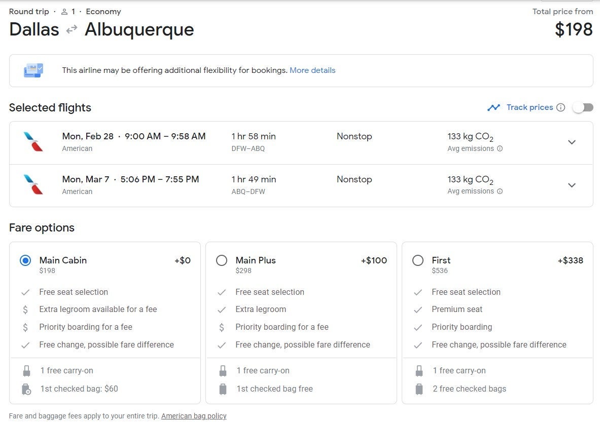 The fares we featured below are for basic economy seating on Delta and United, which only include a carry-on. American fares included here are for the main cabin, which include a carry-on and seat selection. You will have to pay extra for any checked bags with all of these fares.