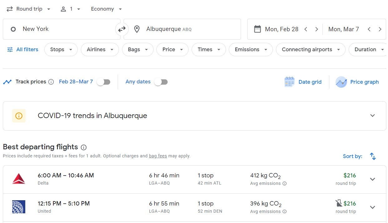 East Coast travelers can fly from New York (LGA) to Albuquerque (ABQ) for $216 round-trip on Delta and United. Both flights include a stopover.