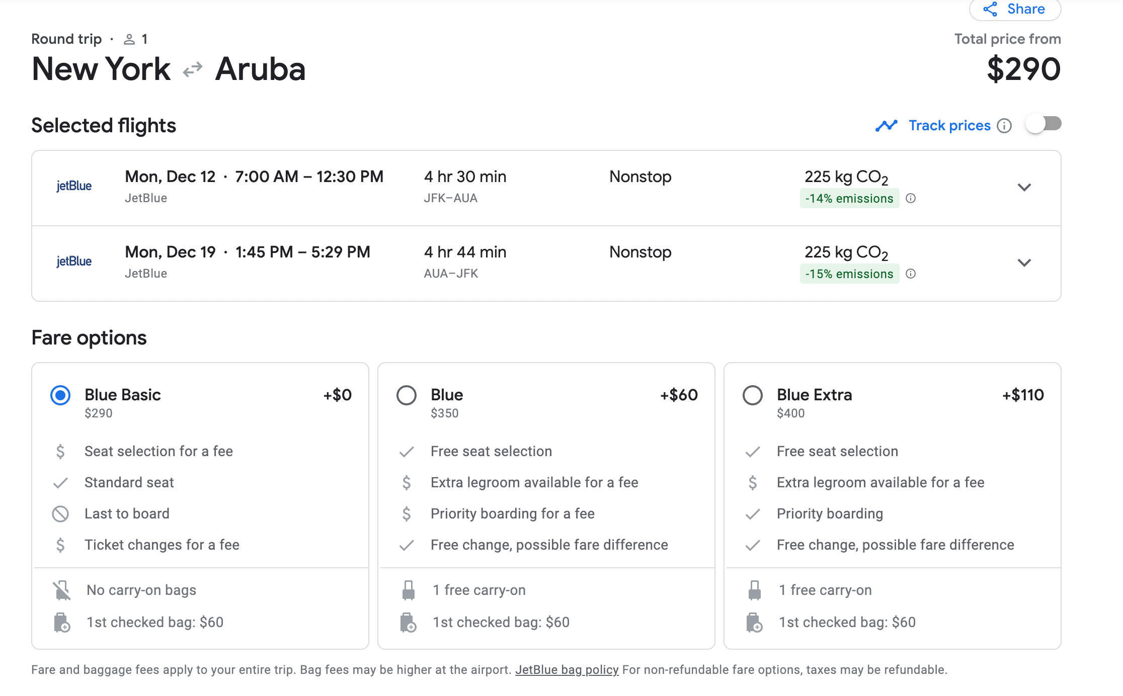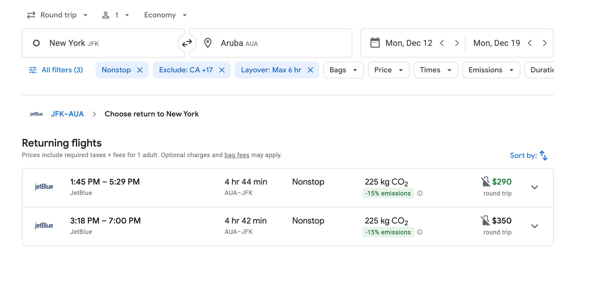 The majority of routes in this deal have layovers. The only ones that don't are flights departing from Newark and JFK. A JetBlue Dec. 12 flight departing from JFK has two times that keep fares at $290. One flight leaves New York City at 7 a.m. and the other at 8:20 a.m.