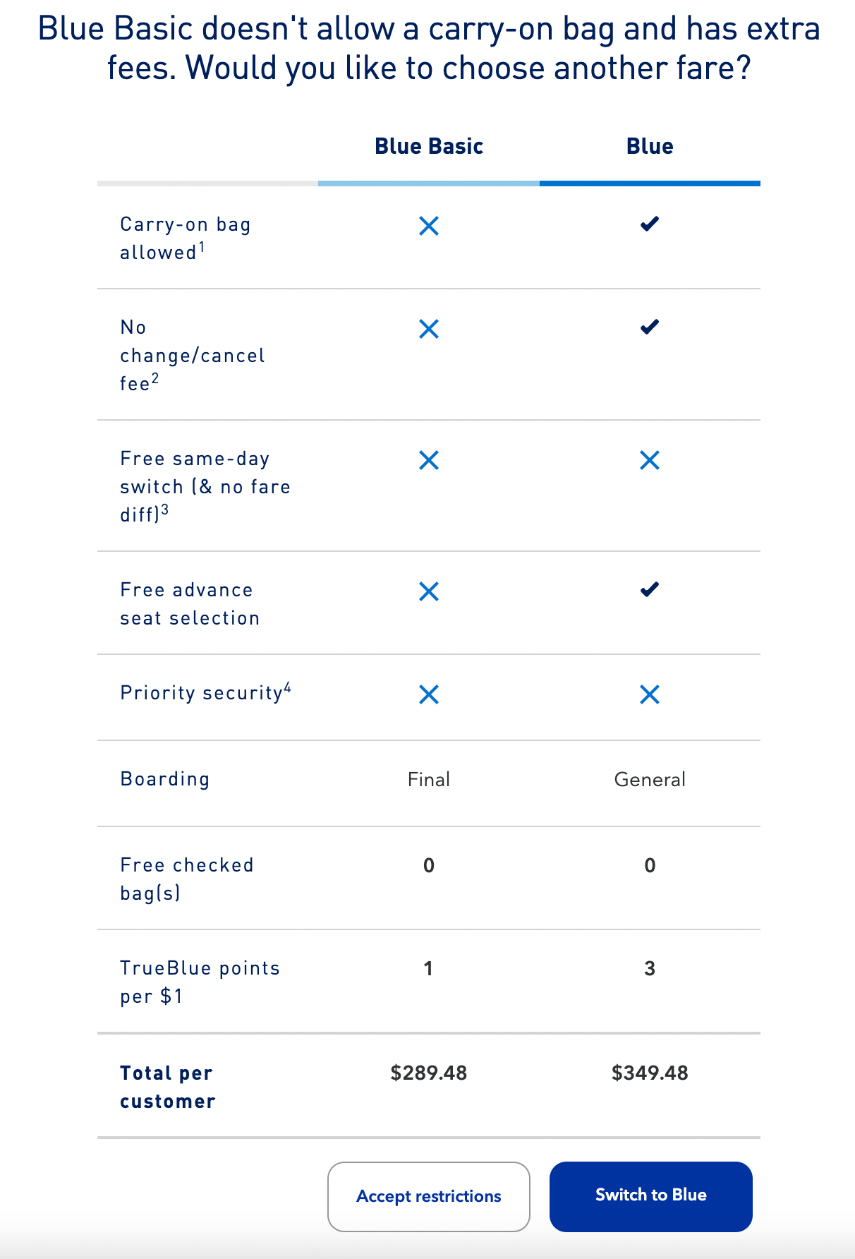 Keep in mind that these basic economy fares have some restrictions. JetBlue's basic economy does not allow passengers to bring carry-ons or to change or cancel flights.