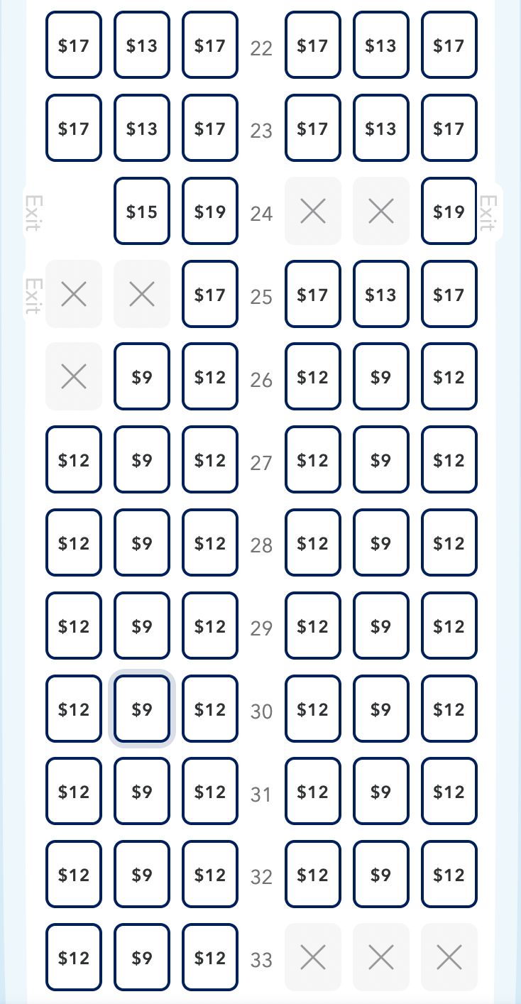 The cheapest seats are $9 middle ones toward the back of the plane, whereas the most expensive seats cost $89 and have more legroom.