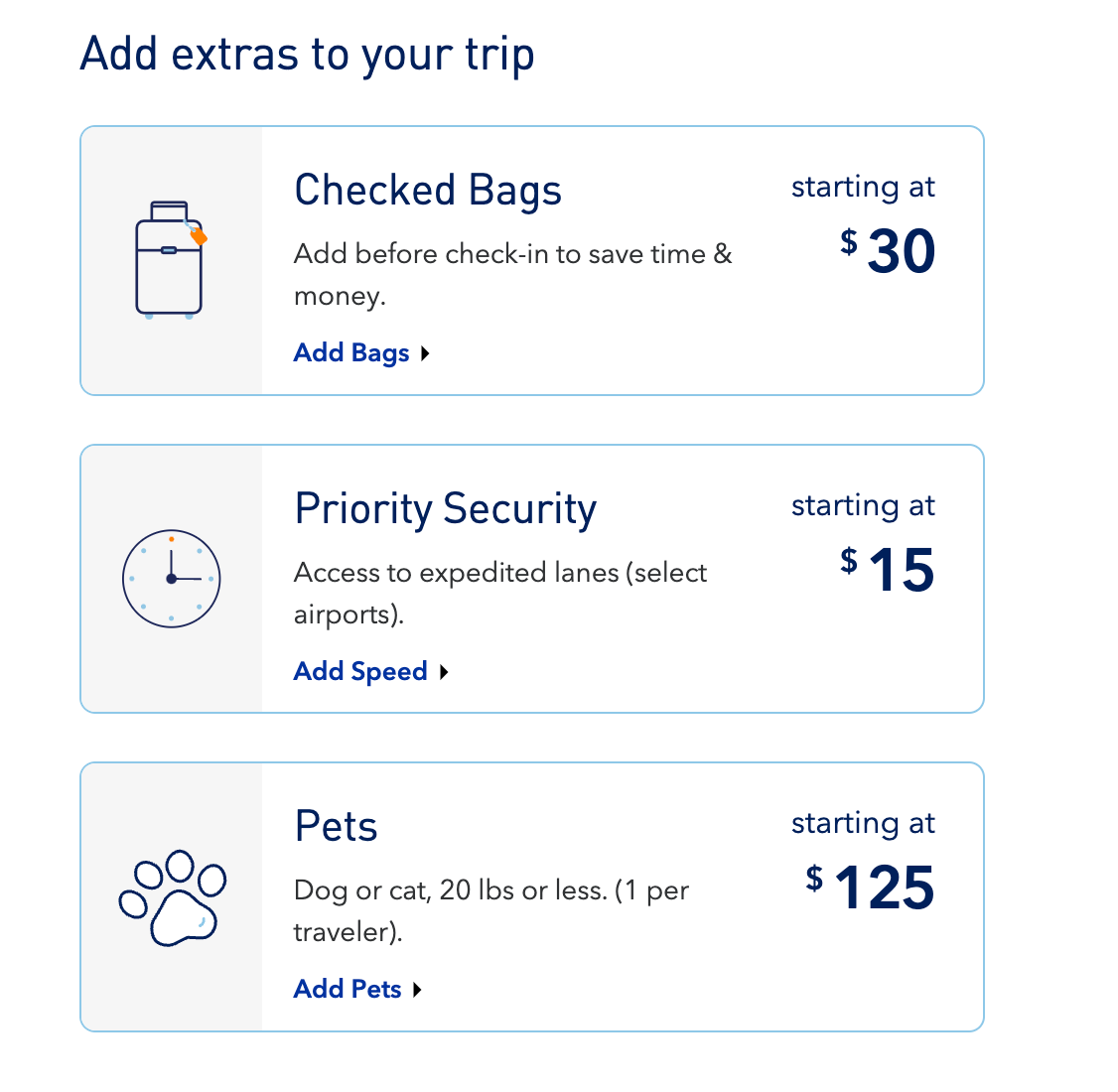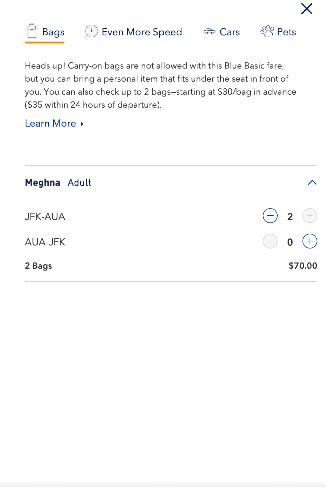JetBlue's Blue Basic fare also tacks on additional fees for seat selection and checked baggage. The first checked bag costs $30 and JetBlue lets you check up to two bags for each flight.