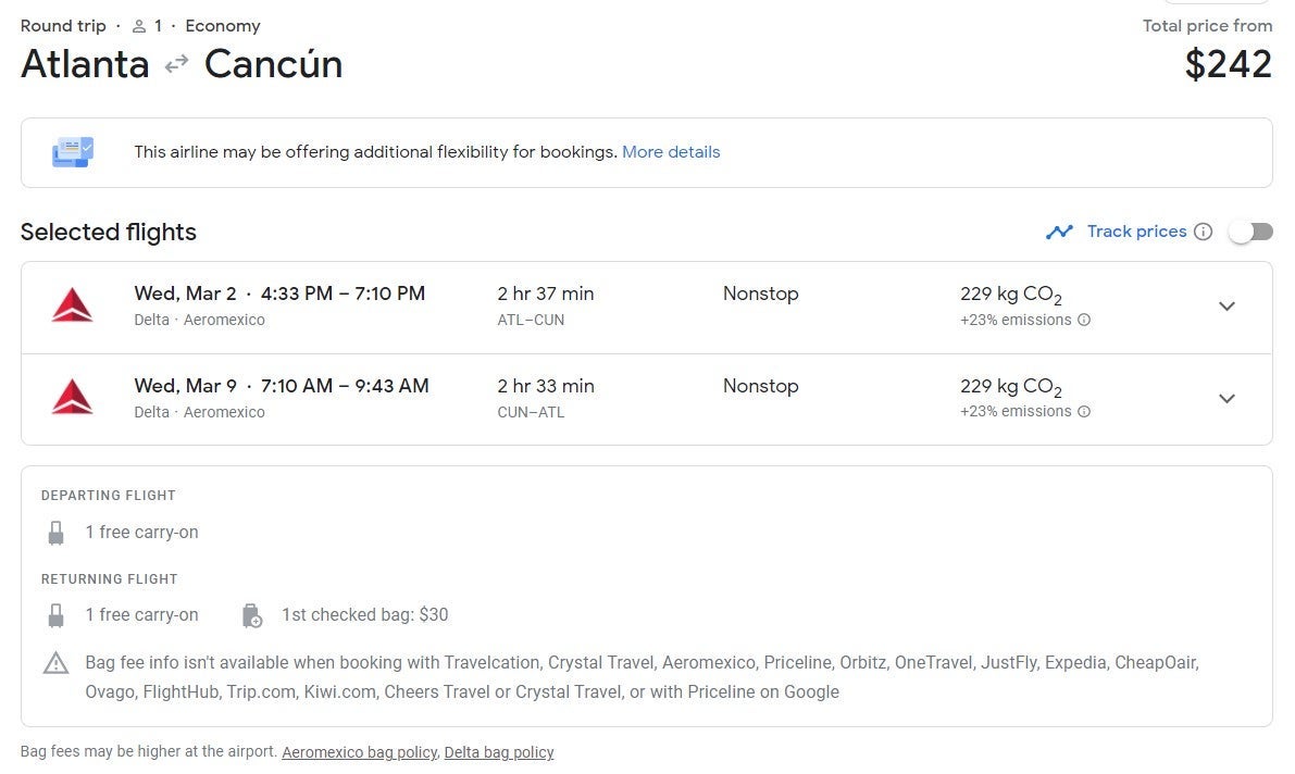 Delta offers nonstop flights from Atlanta (ATL) to Cancun (CUN) for $242 round-trip. The offer below is for the beginning of March, but the deal is widely available.