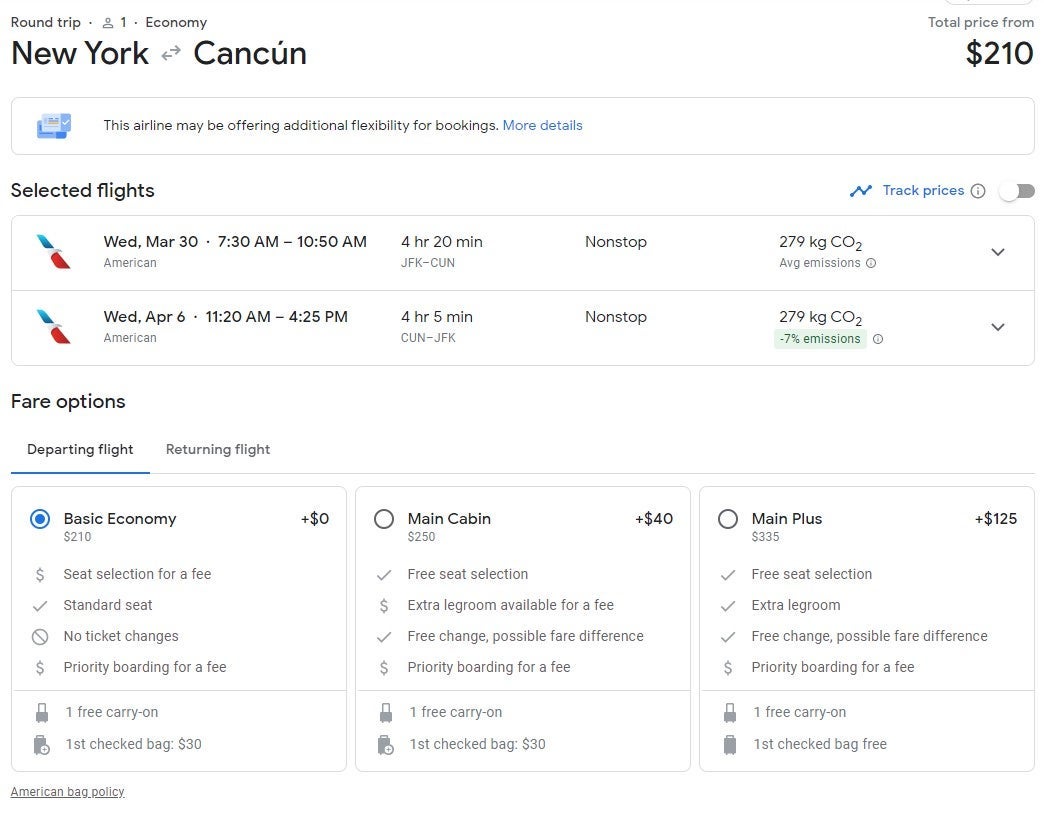 From the end of March to the beginning of April, you can snag a direct flight for $210 on American Airlines from New York (JFK) to Cancun (CUN).