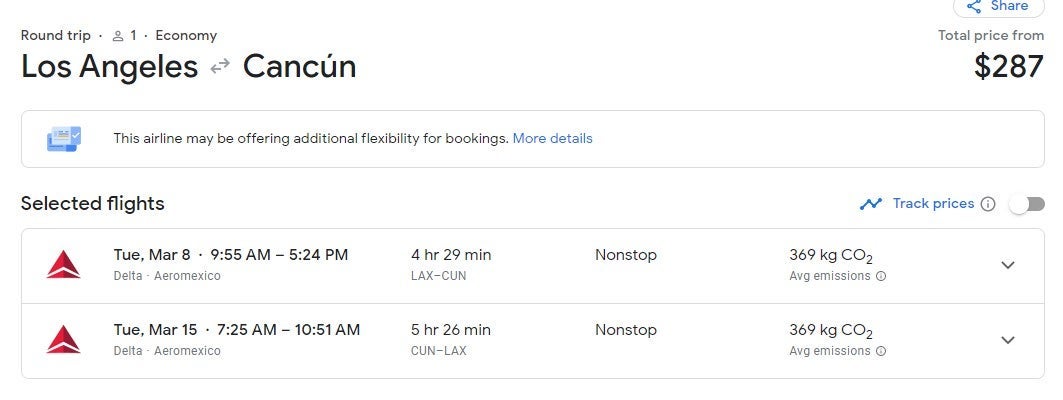 Direct flights from Los Angeles (LAX) to Cancun (CUN) are available for $287 round-trip on Delta.