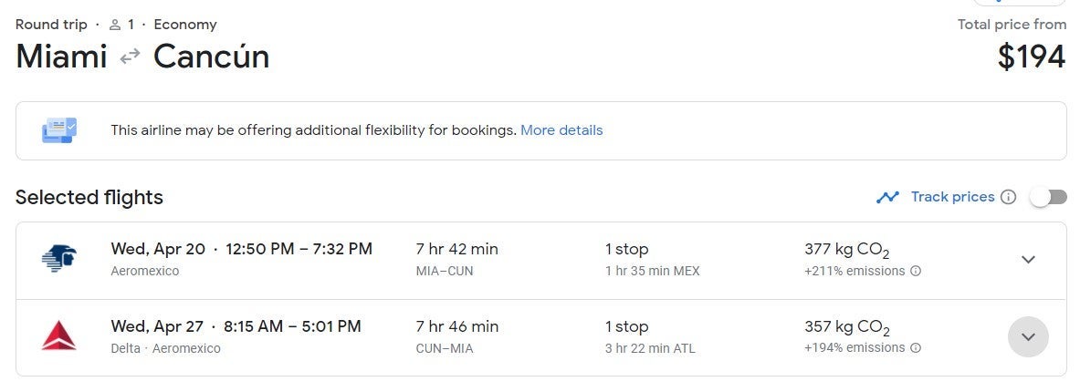 The least expensive deal we found was from Miami (MIA) to Cancun (CUN) for $194. This fare includes a departure on Aeromexico with a stop in Mexico City (MEX), and the return flight is on Delta with a stop in Atlanta (ATL).
