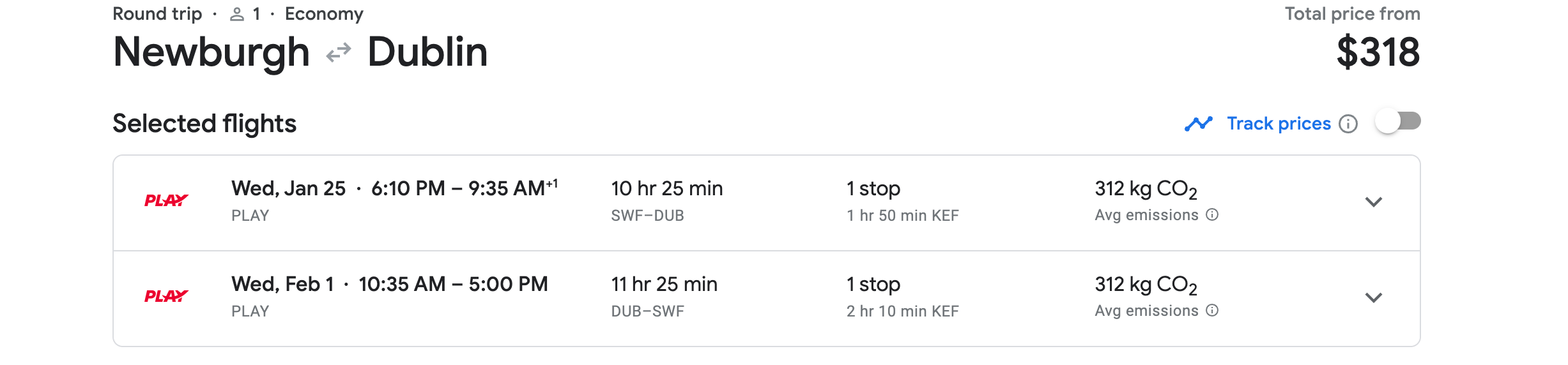 The sticker price for the Play flight to Dublin on Google Flights is $318, but when booking on PLAY's website, fares are $322.89. The flight to and from Dublin includes a layover in Reykjavik, Iceland, for approximately two hours.
