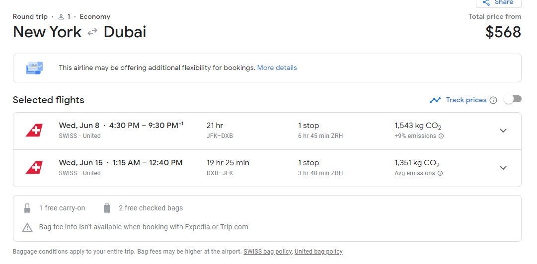 One of the cheapest options we came across was from New York (JFK) to Dubai (DXB) for $568 round trip in June with a stop in Zurich (ZRH) each way.