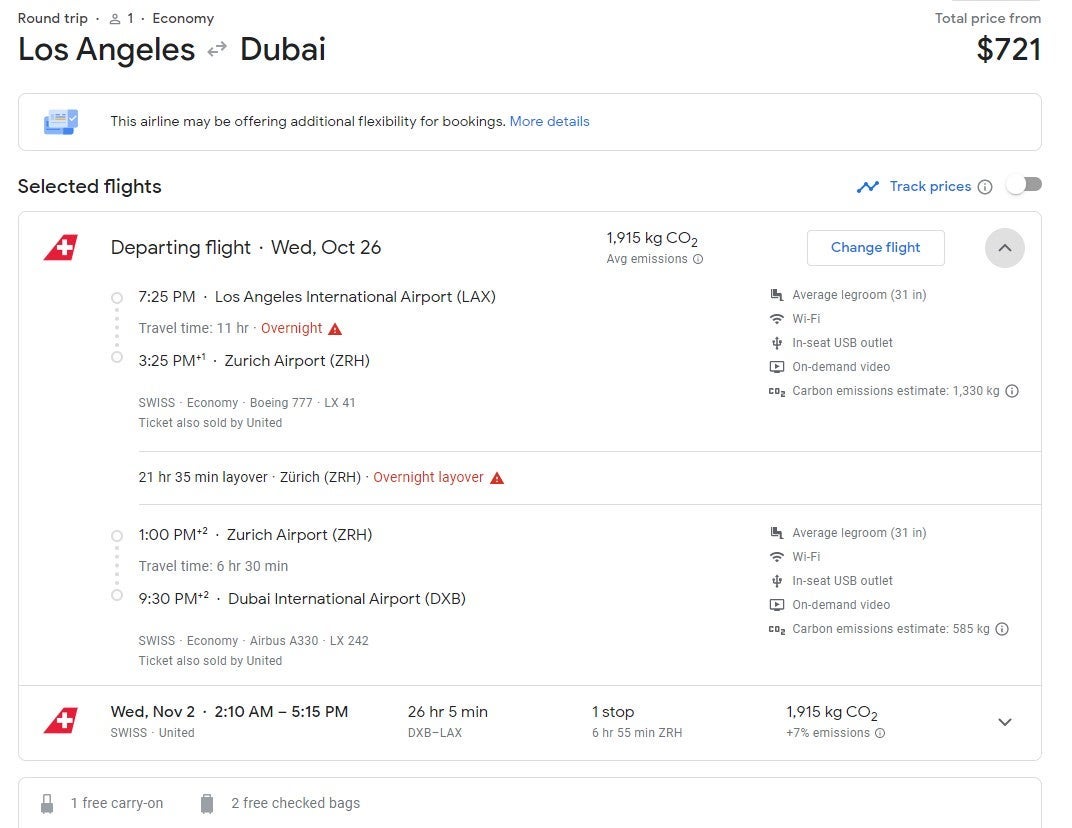 Travelers can fly to Dubai (DXB) from Los Angeles (LAX) for $721 round trip in October. There are stops in Zurich (ZRH) each way. The departure flight allows for nearly a full day in Zurich to explore a tiny bit of Switzerland's largest city.